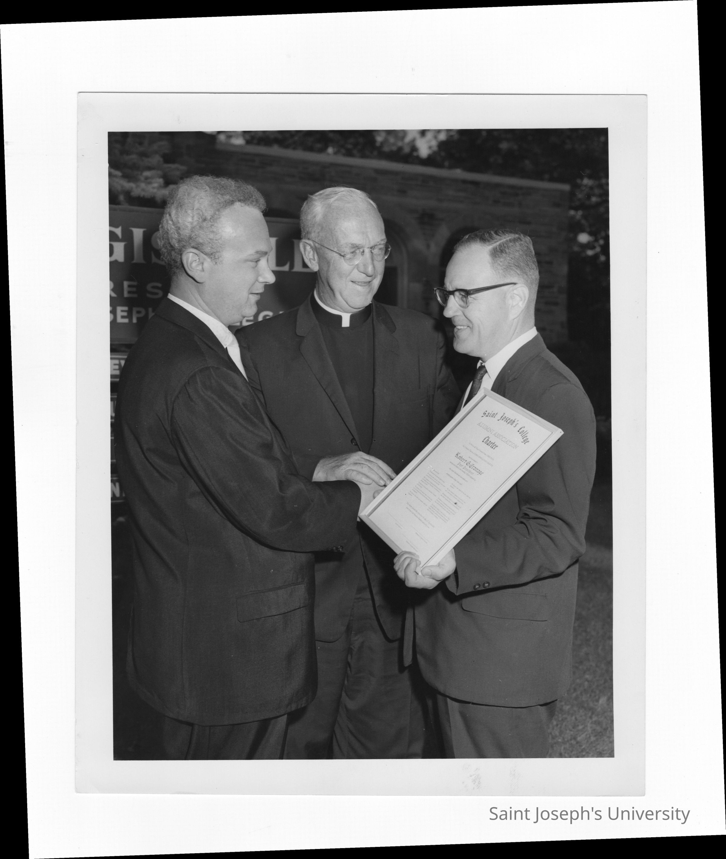 Past alumni association president, Robert Cranage, receiving alumni association Charter award from J. Joseph Bluett, S.J., and Frank X. Duff, September 17, 1961.
