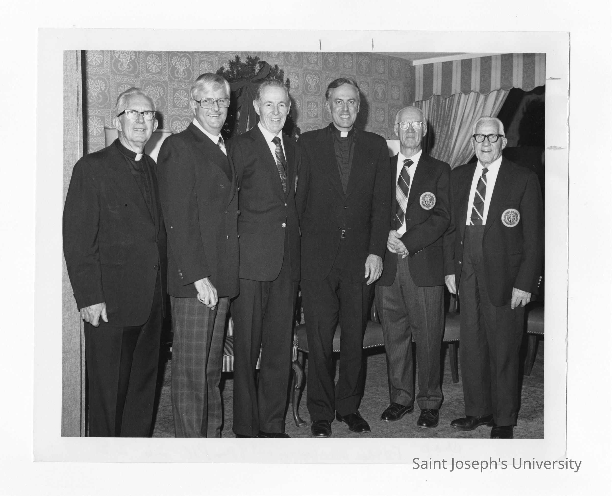 Donald I. MacLean, S.J.,and Matthew Sullivan, S.J., awarding presidential blazers to past presidents of alumni association, including Charles Brennan (?), December 5, 1978.