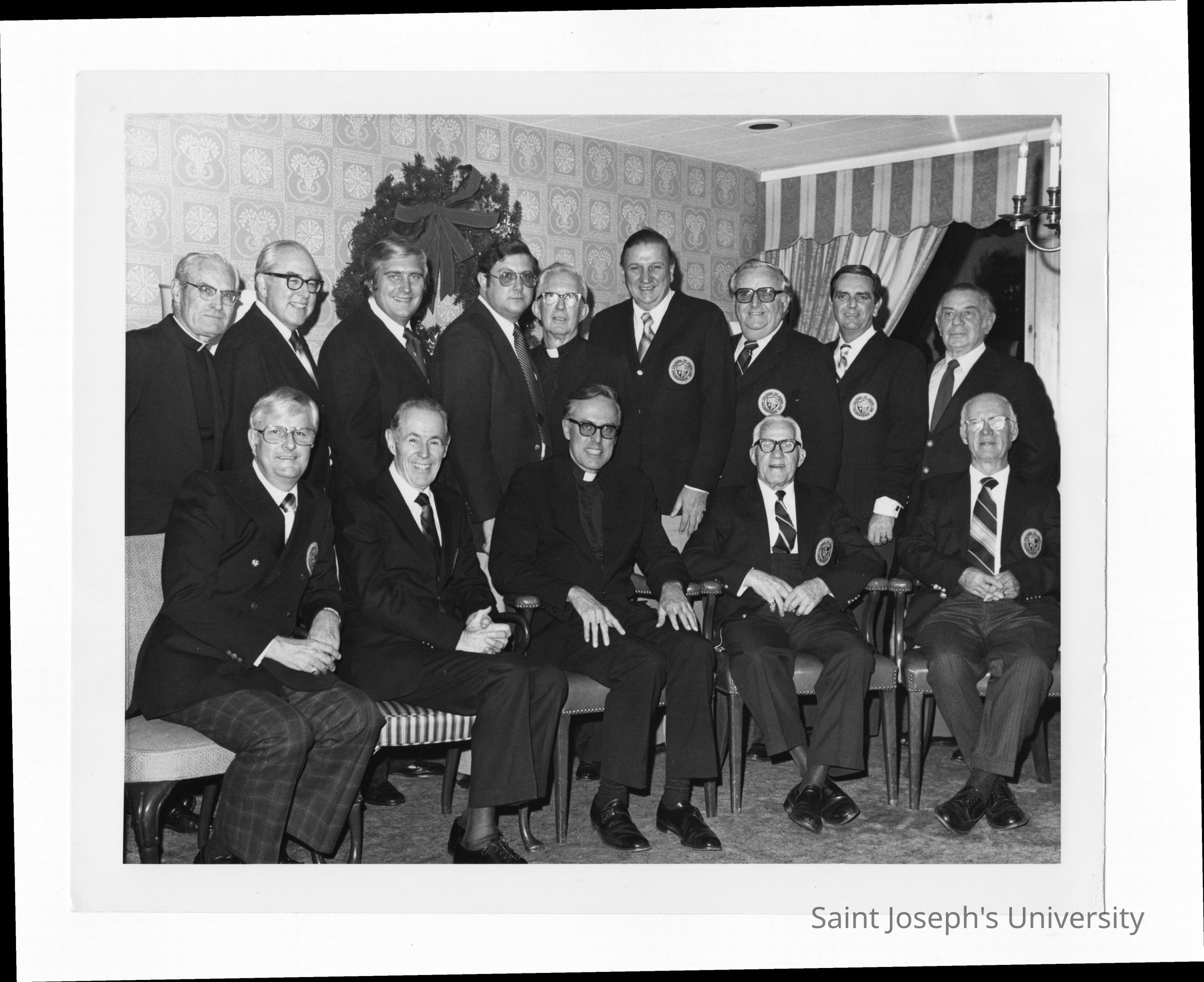 Donald I. MacLean, Michael Smith, S.J., and Matthew Sullivan, S.J. with past presidents of alumni association who have received presidential blazers, December 5, 1978.