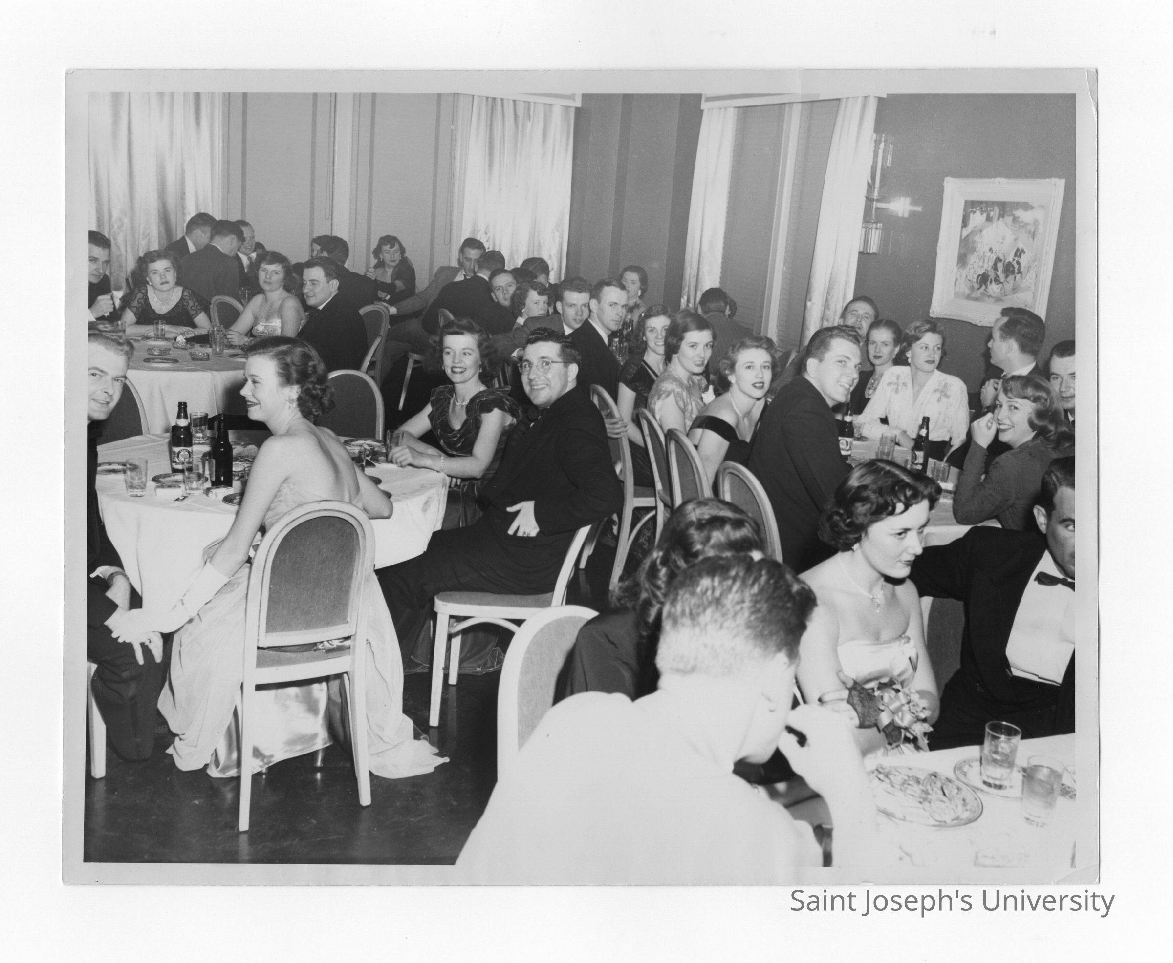 View of young alumni association members and their guests attending formal dinner, c. 1949.