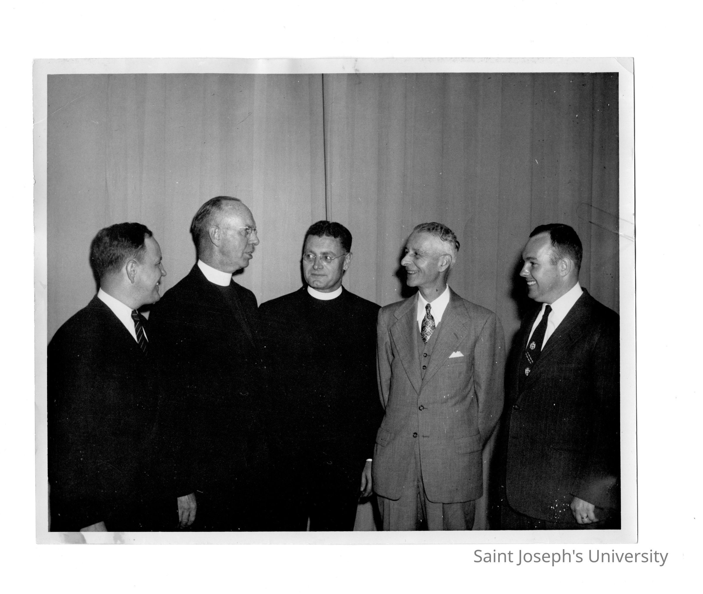 Dennis J. Comey, S.J., Edward G. Jacklin, S.J, Daniel Dougherty (?), and others conferring during alumni communion breakfast, October 26, 1952.