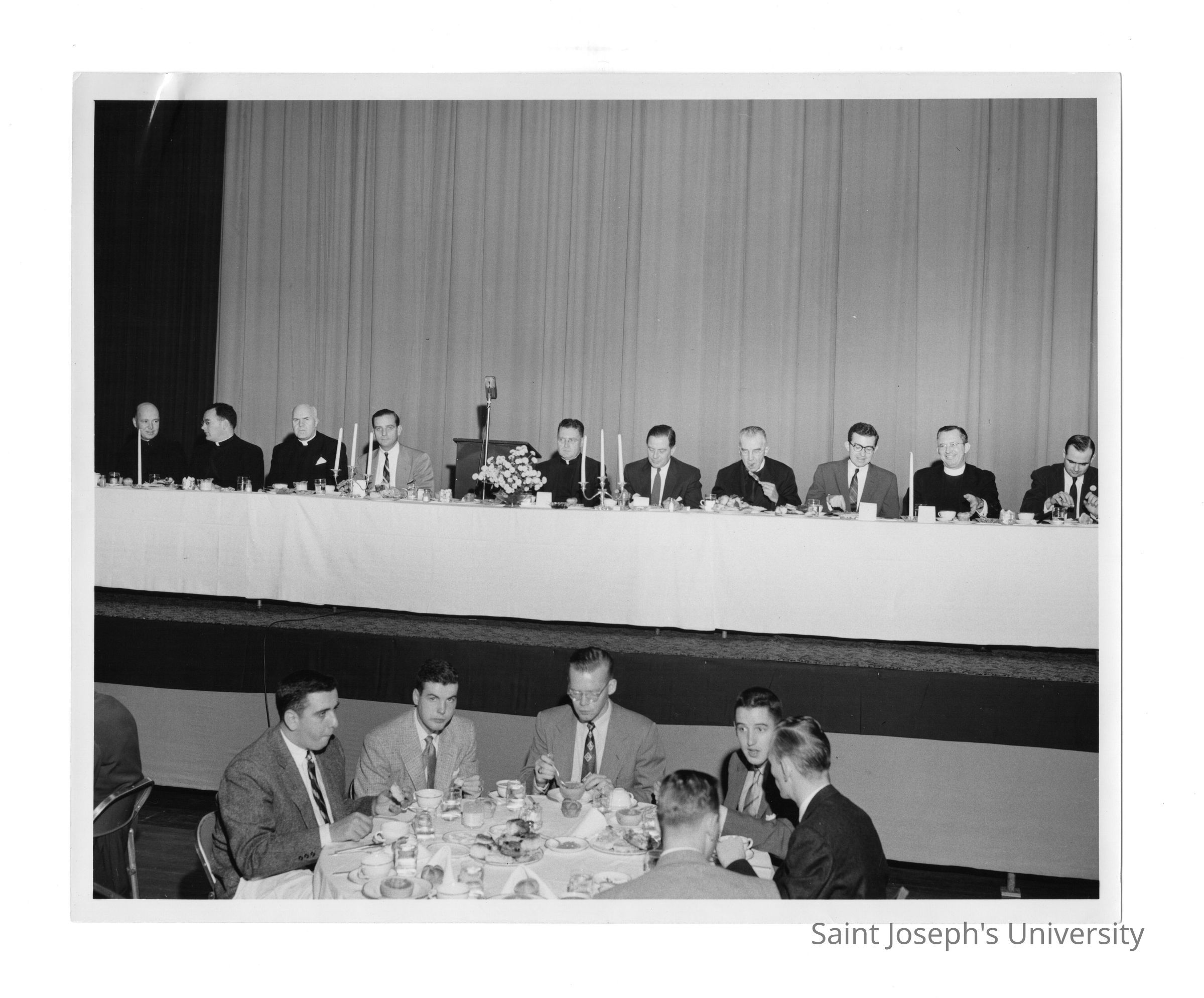 View of head table at alumni communion breakfast, October 30, 1955, with Fr. McNamara, Fr. Leary, Hunter Guthrie, S.J., Charles Krull, Edward G. Jacklin, S.J., Frank Lammer, Joseph S. Hogan, S.J., James Duffin, Matthew Sullivan, S.J., Richard Carroll.Entry/Object ID