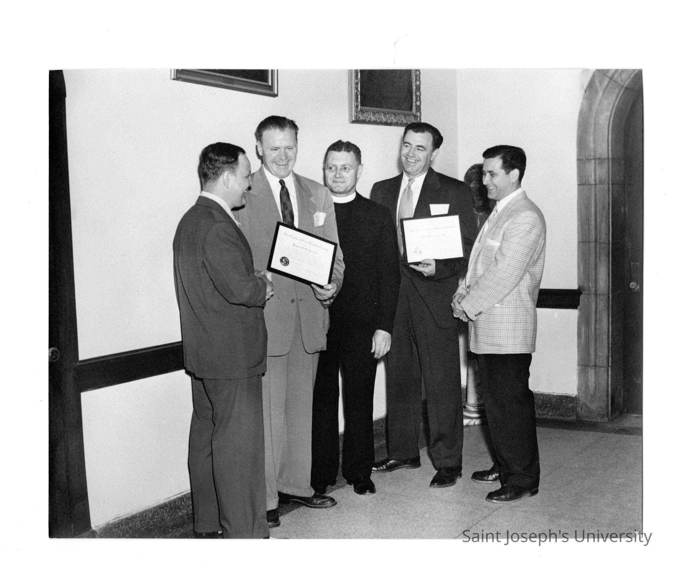 Alumni homecoming event, June 4, 1953, with Robert Cranage, Robert Larkin, Edward G. Jacklin, S.J., John Gillespioe, and William F. Ariano. Gillespie and Larkin received awards as football coaches at Northeast Catholic High School.Entry/Object ID