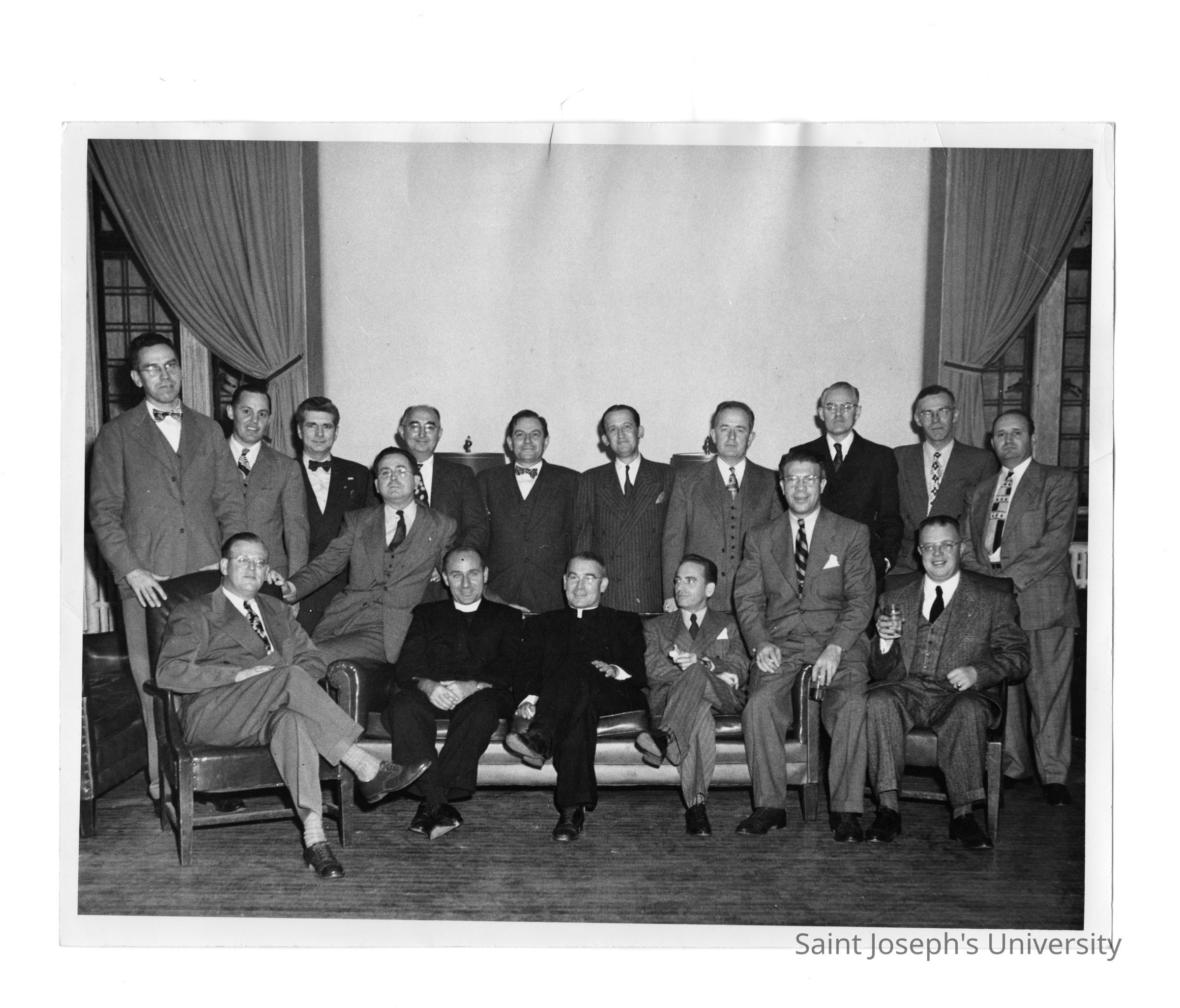 Alumni reunion of class of 1928 held on October 28, 1948. John J. Long, S.J., in pictured in center of group.
