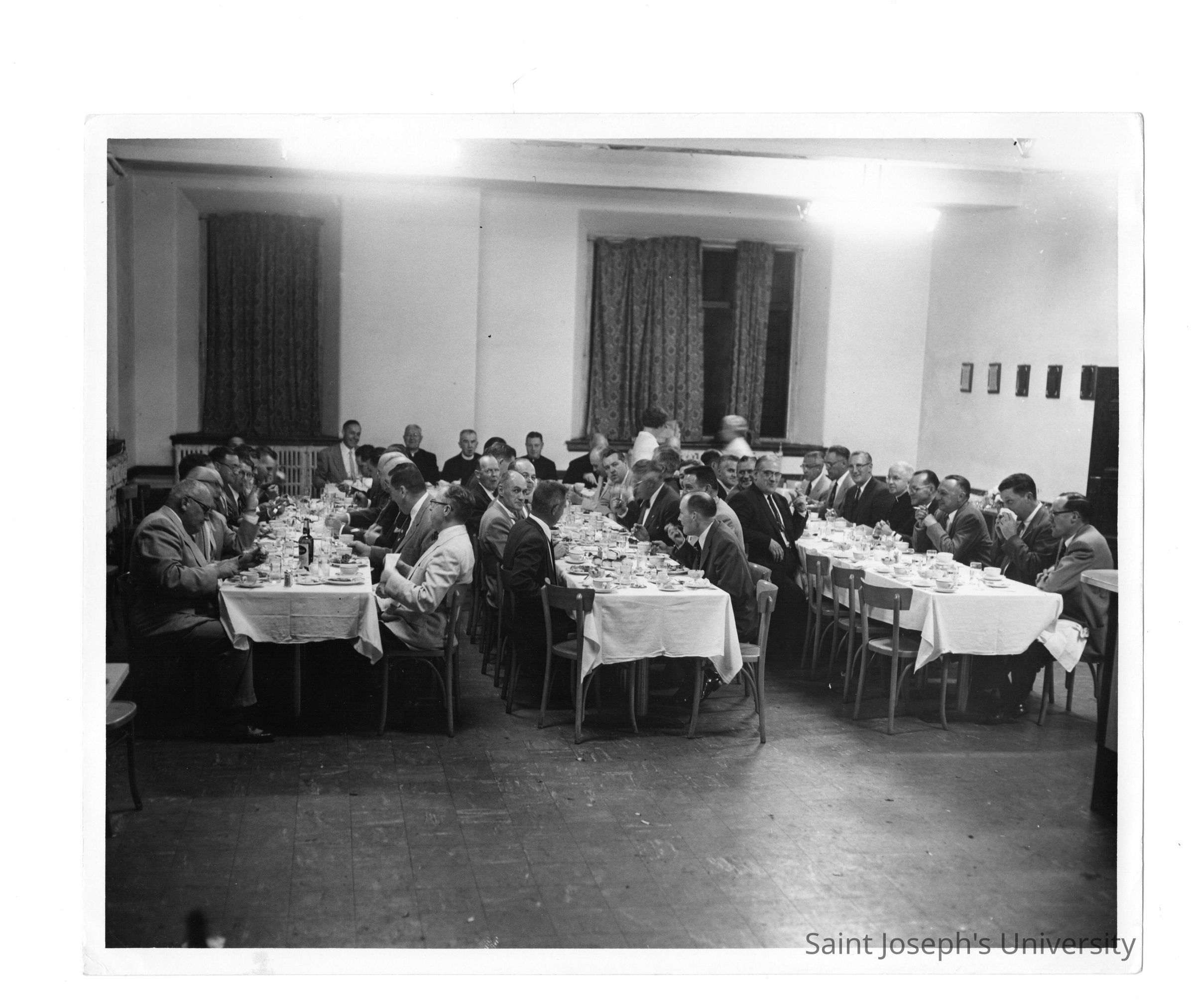Alumni reunion of class of 1931, held June 1956. View of alumni eating dinner and includes Edward G. Jacklin, S.J., and Joseph S. Hogan, S.J.