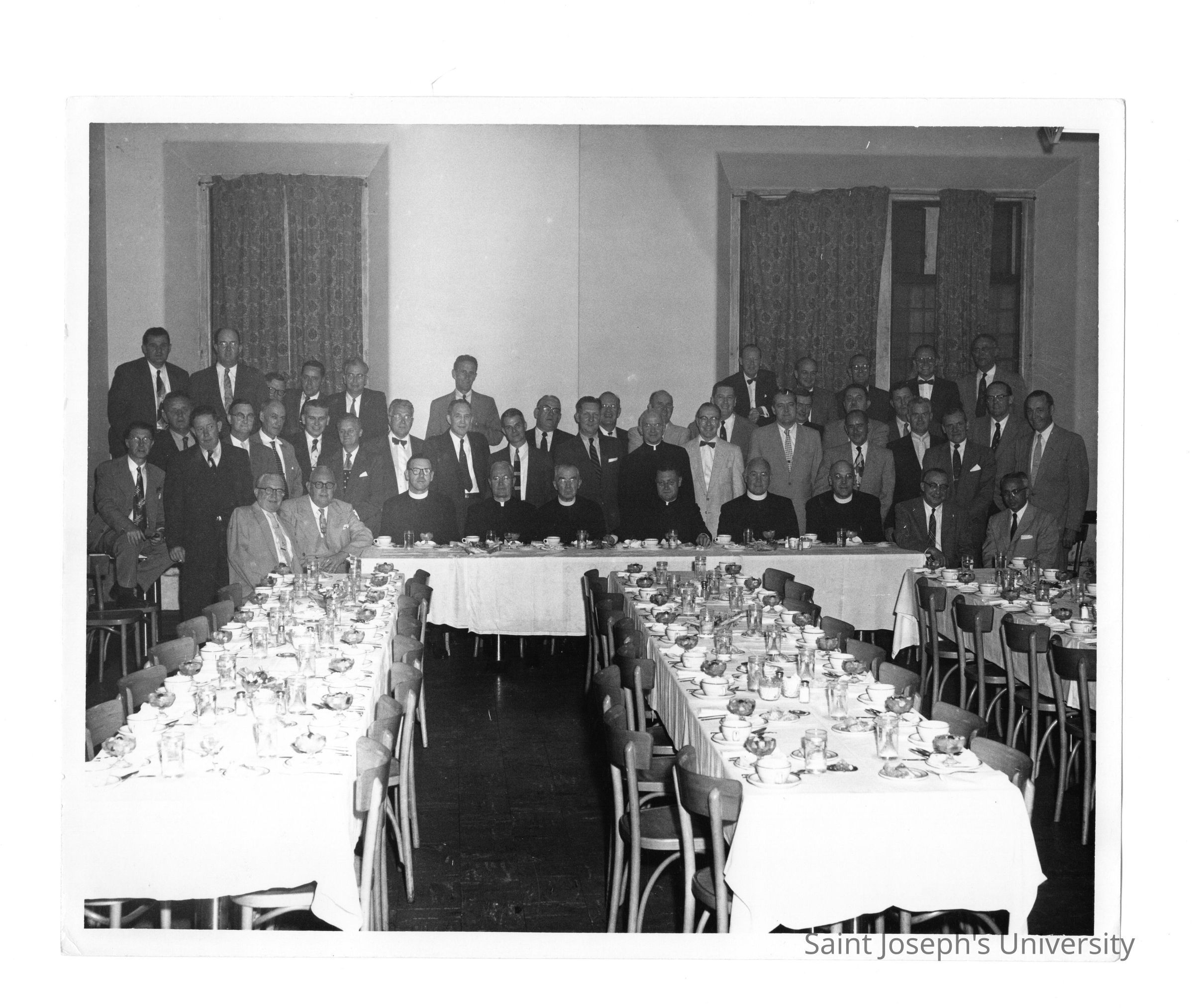 Alumni reunion of class of 1931, held June 1956. View of alumni group prior to eating dinner and includes Edward G. Jacklin, S.J., and Joseph S. Hogan, S.J.