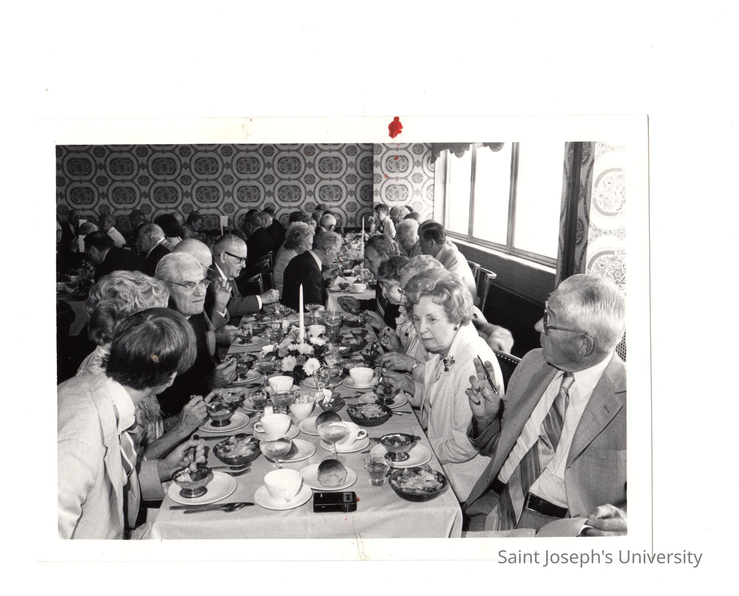 Alumni reunion of class of 1931 held on May 16, 1981. View of alumni and guests eating dinner with Michael Smith, S.J.
