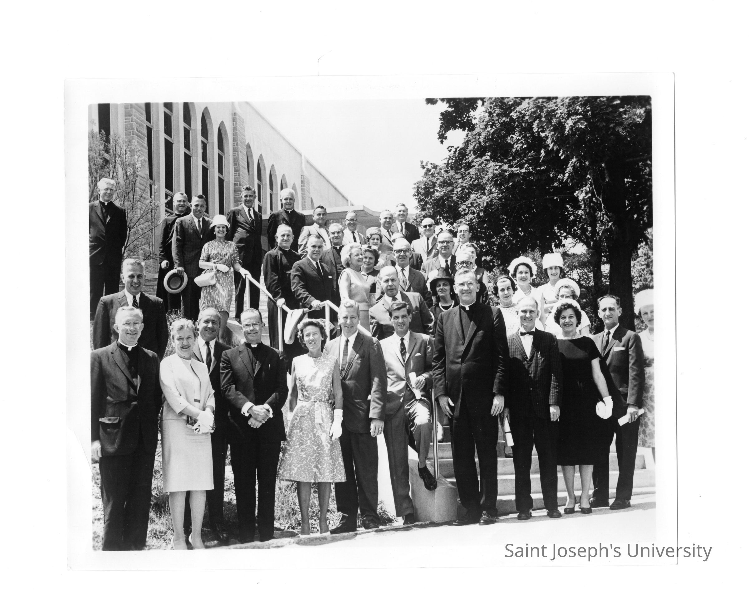 Alumni reunion of class of 1938, held June 1, 1963. Group photo of alumni and spouses taken outside of Drexel Library and includes William F. Maloney, S.J., Matthew Sullivan, S.J., Emory Ross, S.J.,and Michael Smith, S.J.,Entry/Object ID