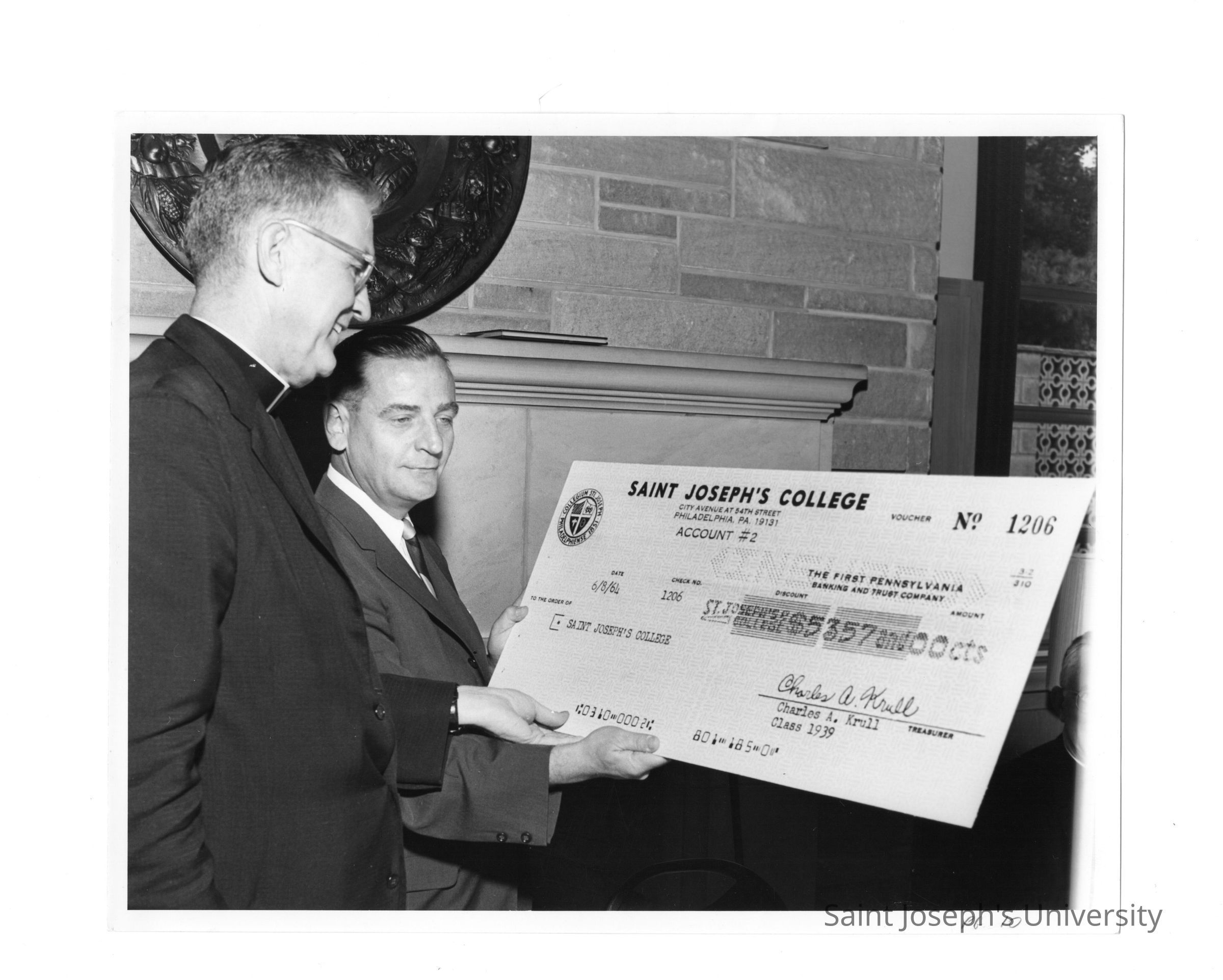 Alumnus from class of 1938--Charles Krull-- presenting William F. Maloney, S.J. with check for $5,357.00 during twenty-fifth reunion, June 6, 1964
