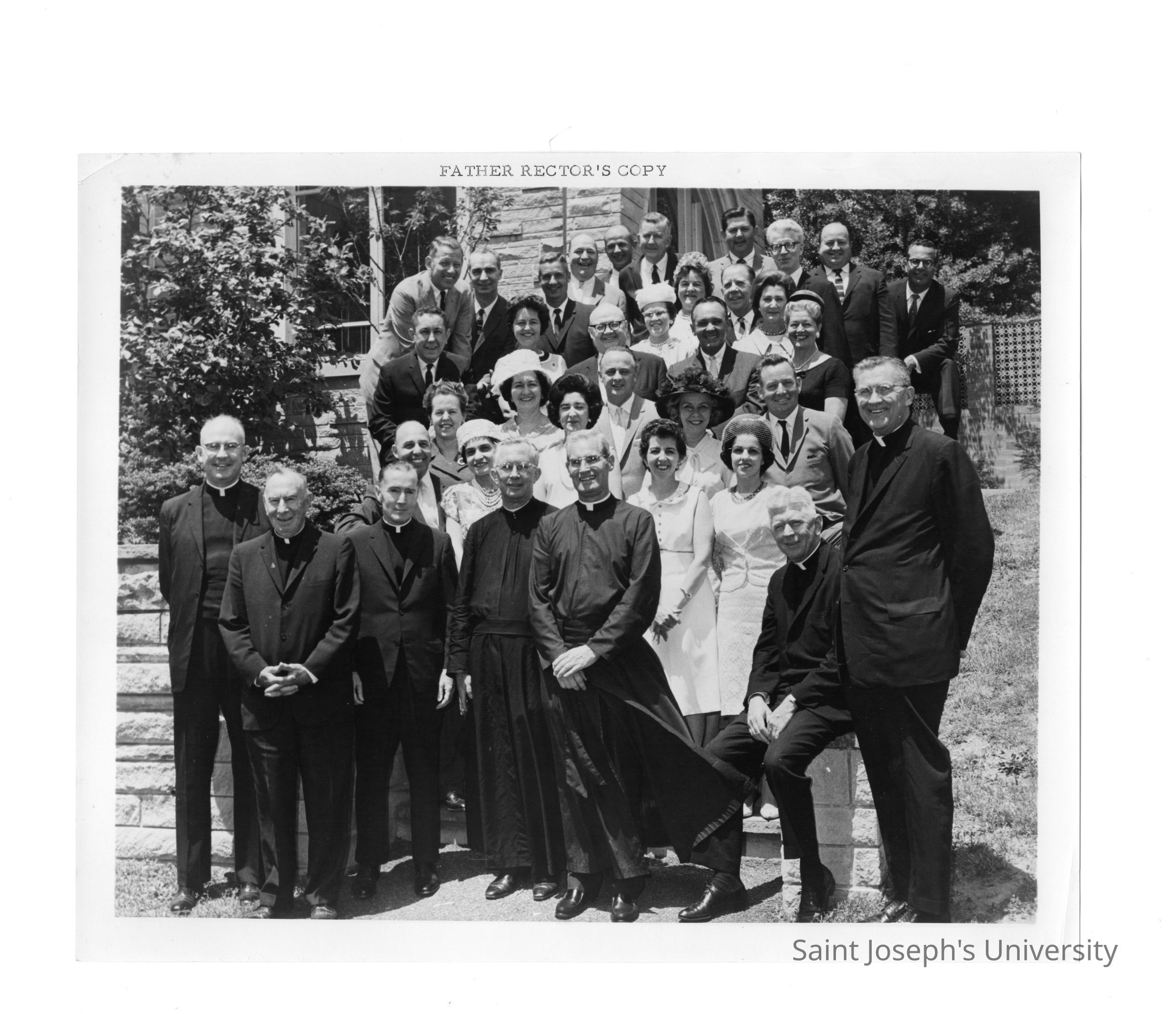 Alumni and spouses from class of 1940 at reunion, held June 5, 1965. Group photo taken outside Campion Center and includes Matthew Sullivan, S.J., Michael Smith, S.J., and William F. Maloney, S.J.Entry/Object ID