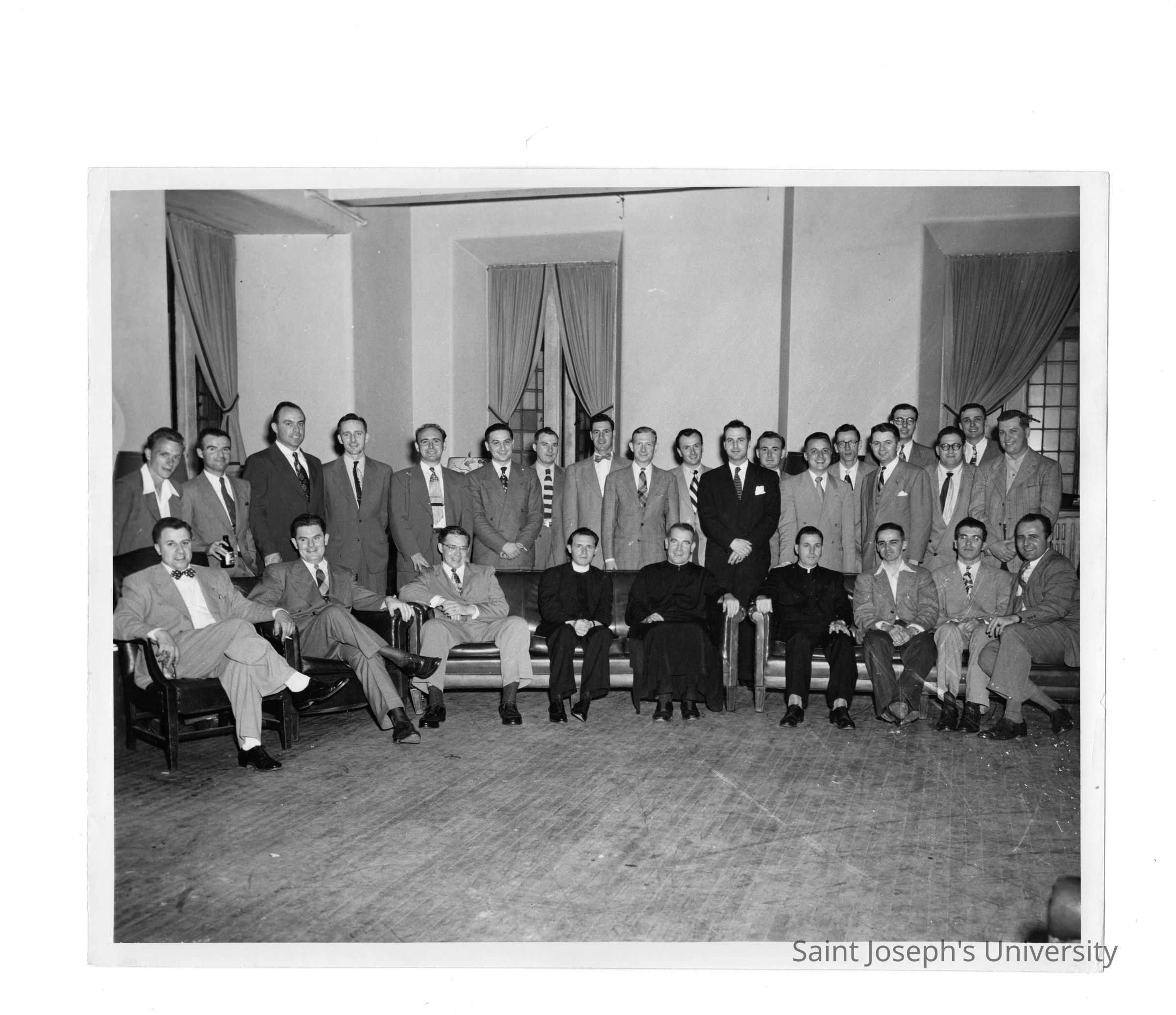 Alumni reunion of class of 1941, held May 1949. Group photo includes John J. Long, S.J., and Stokes (?)