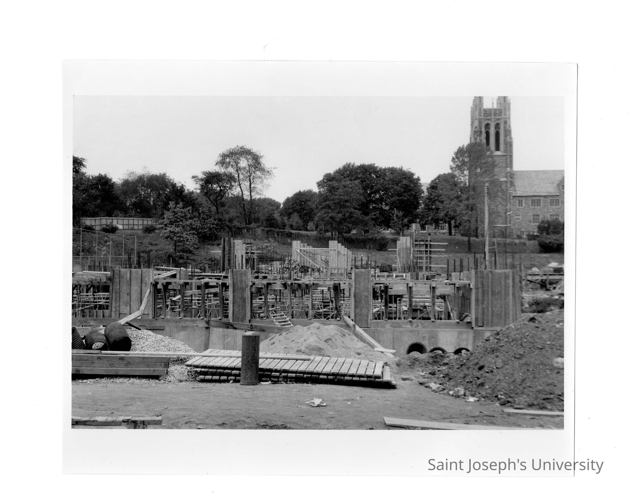 Exterior view of Bellarmine during early construction with Barbelin Tower in background.