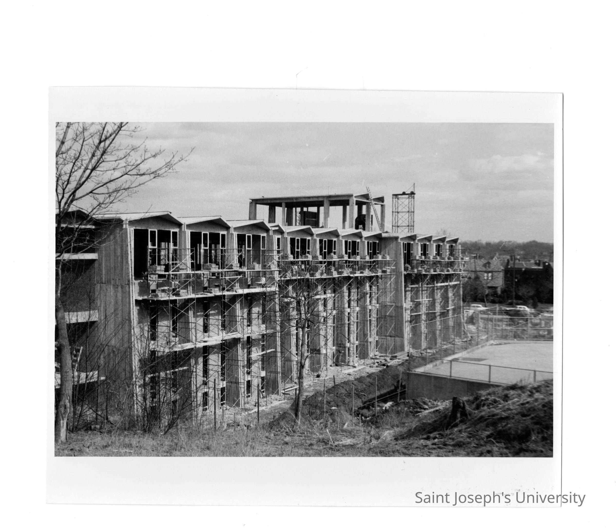 View of Bellarmine under construction with neighborhood in background.