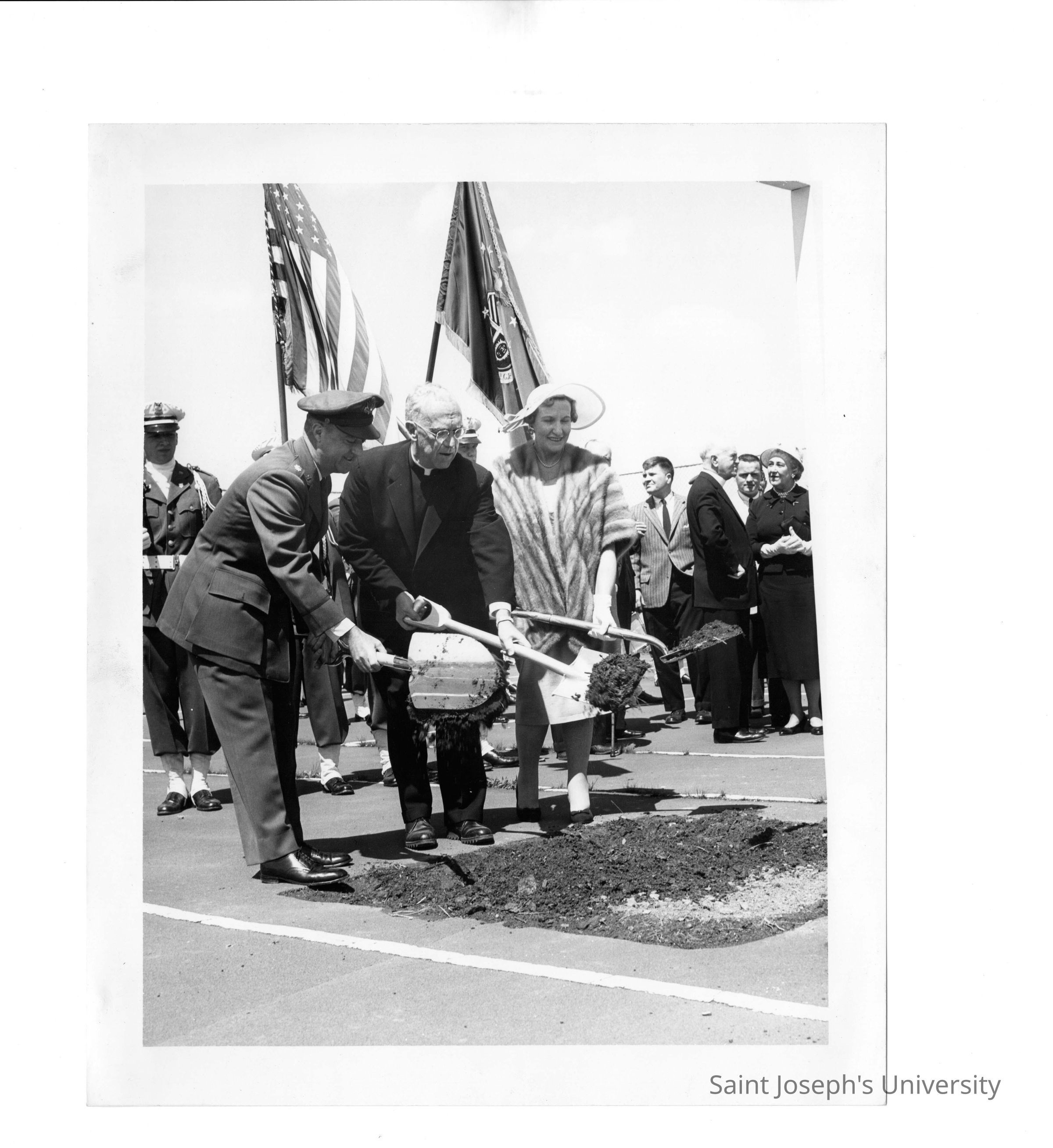 Bellarmine groundbreaking with Lt. Col. Philip DiPiero, USAF, J. Joseph Bluett, S.J., and Mrs. Nicholas Kueny