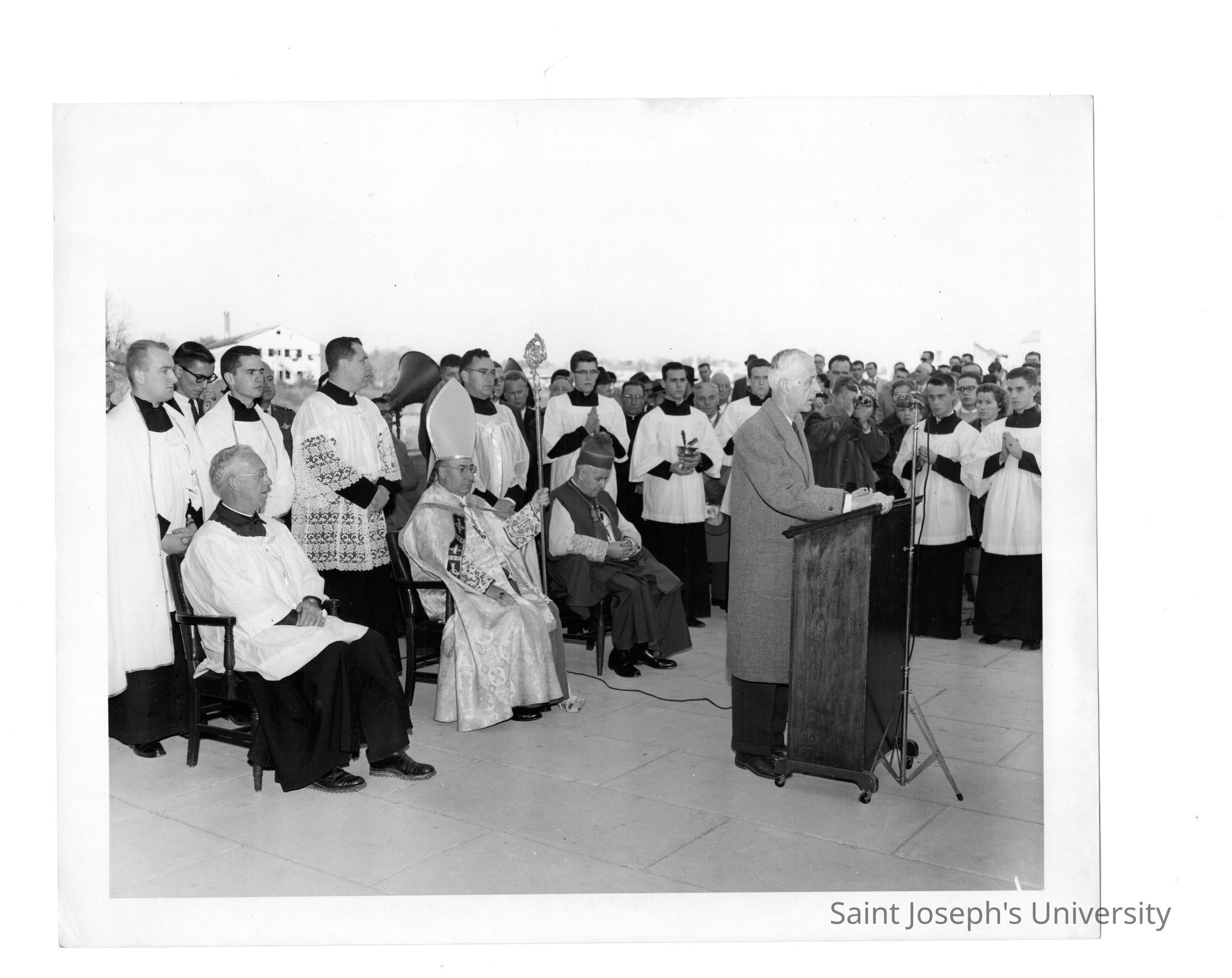 Bellarmine dedication with J. Joseph Bluett, S.J., Rev. Egidio Vagnossi, Rev. Joseph McShea, and Daniel J. Dougherty and others.