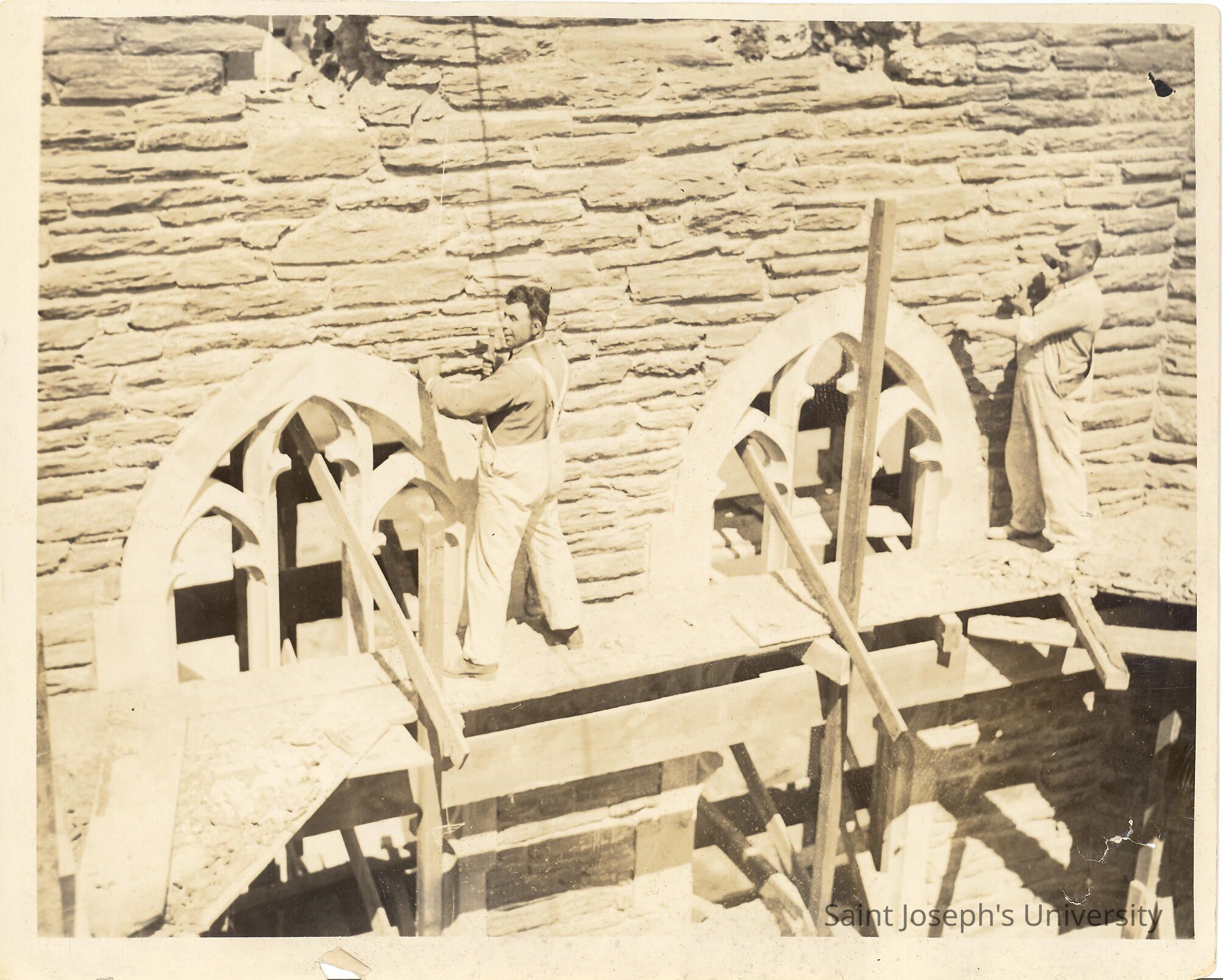 Exterior view of Barbelin building under construction with two stone masons on scaffolding working on gothic tracery.