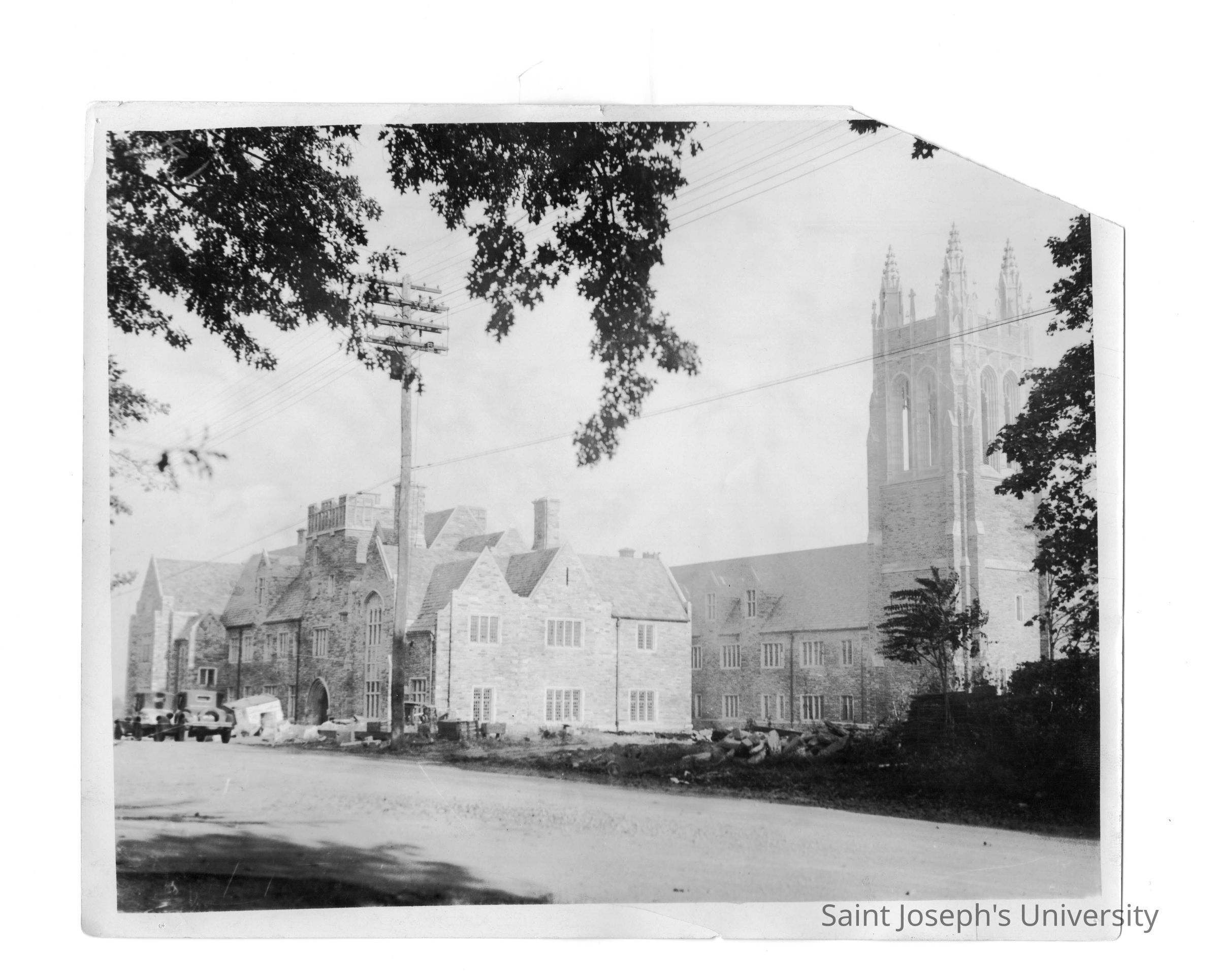 Exterior view of Barbelin building from City Avenue near end of construction with two automobiles in front.