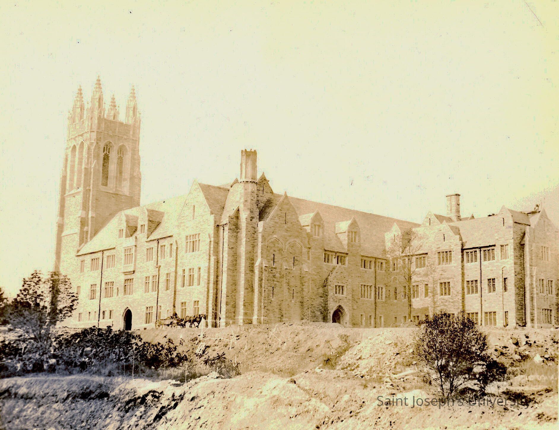 Exterior view of southern façade of Barbelin building near end of construction with two horses pulling supply wagon.