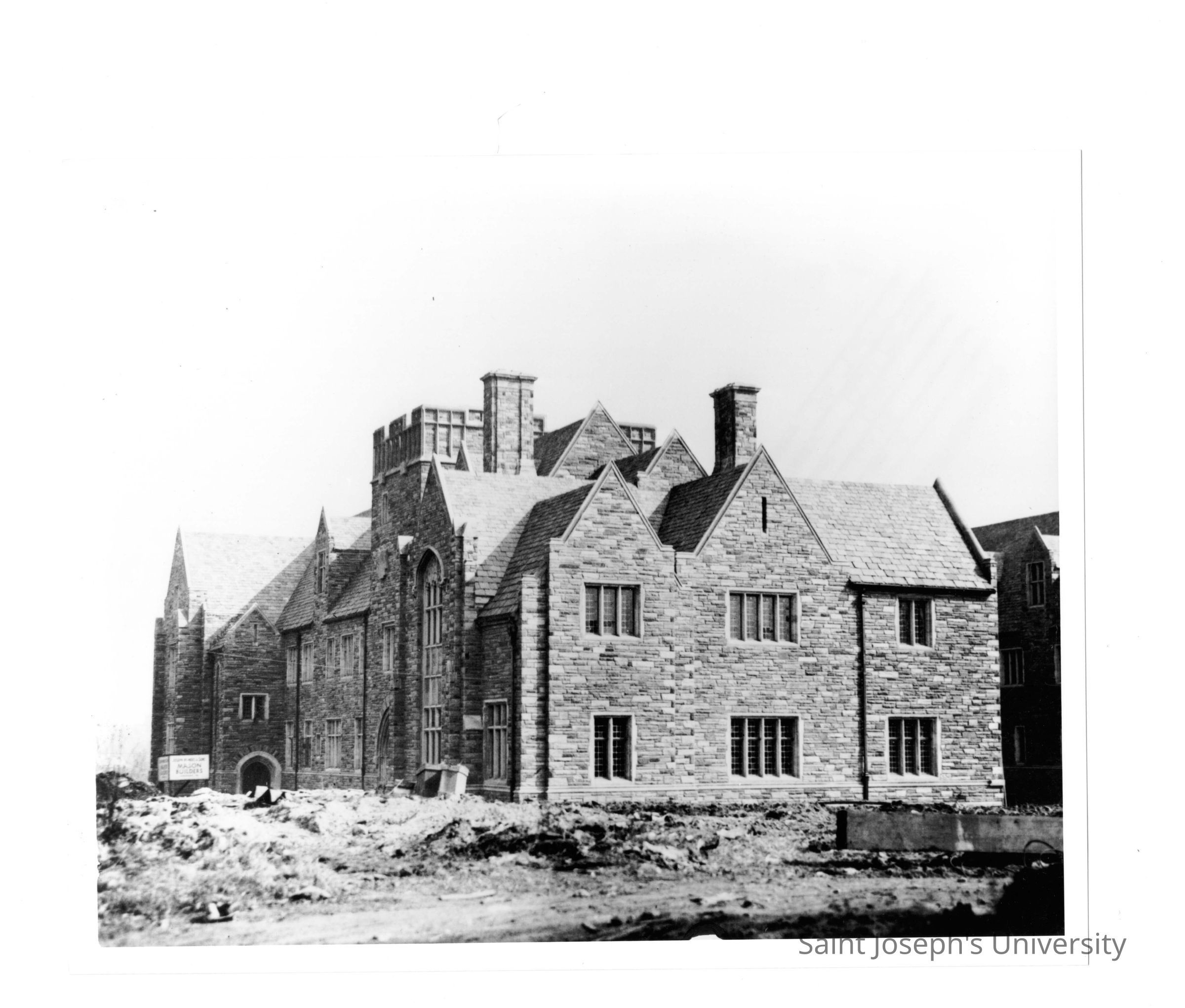Exterior view of Barbelin building near end of construction with sign, "Joseph M. More and Sons, Mason Builders." [?]