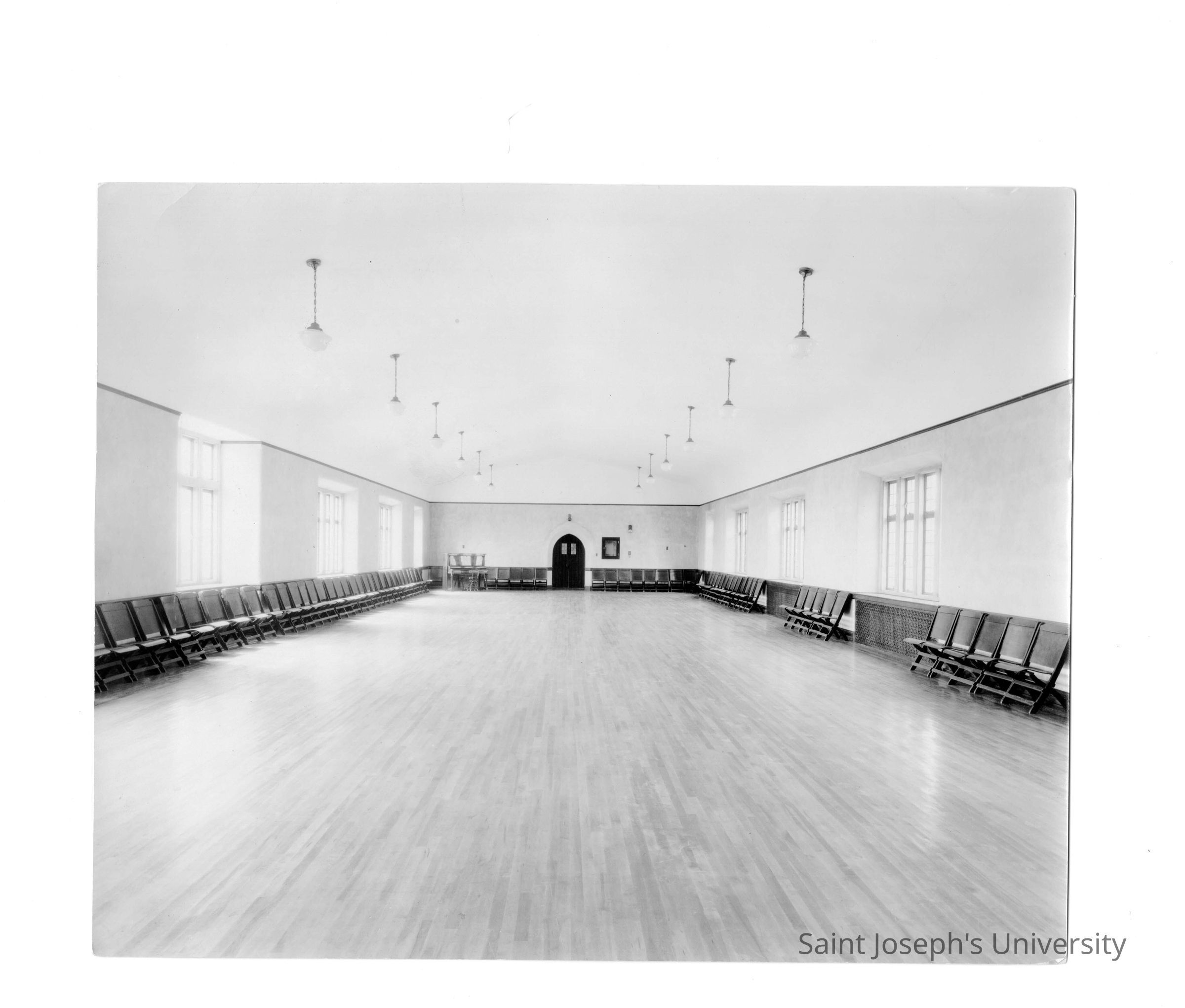 Interior view of college auditorium in Barbelin Hall. The room is empty and chairs are lined up along the walls.