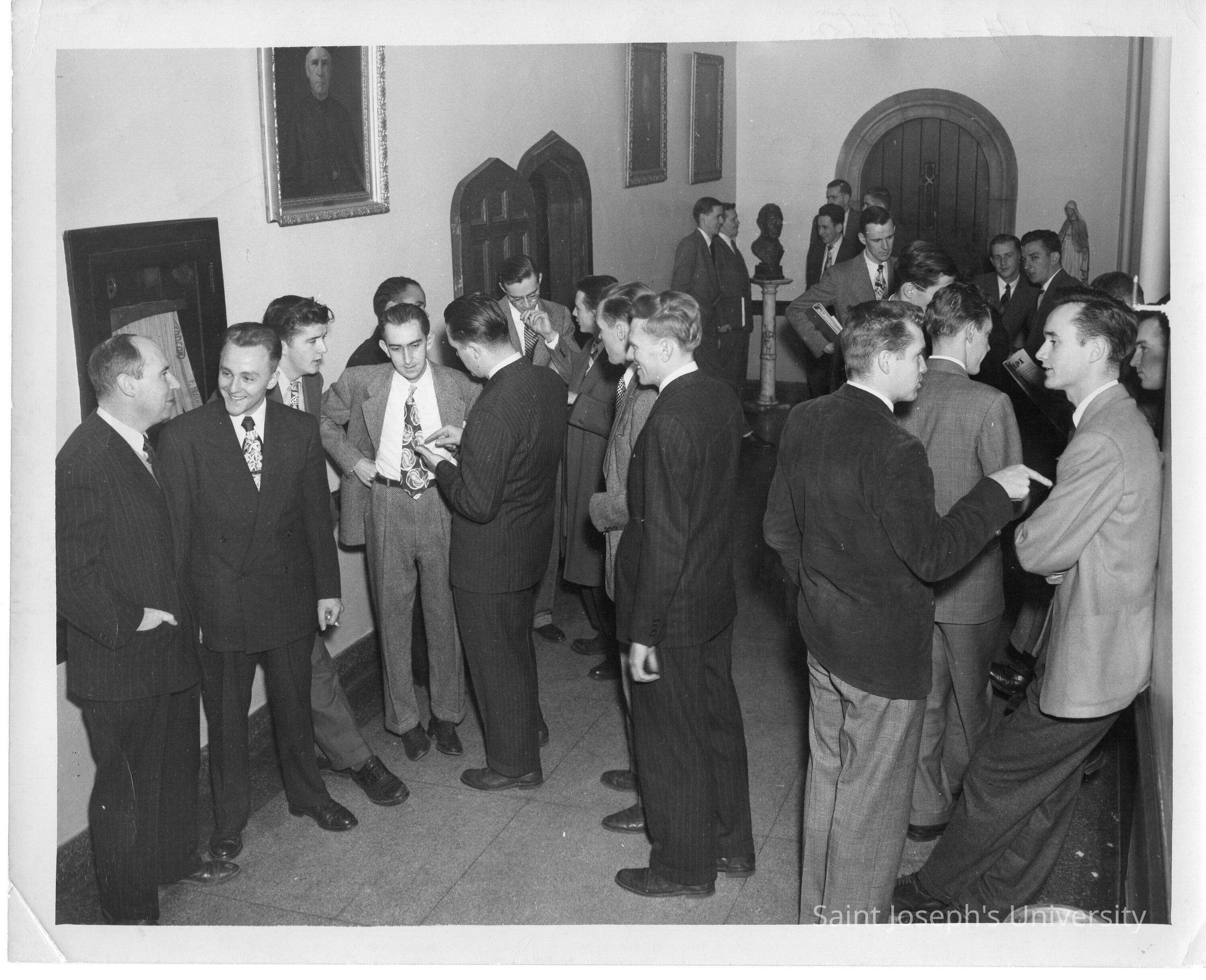 Interior of hallway in Barbelin building with approximately twenty students talking and one smoking cigarette.