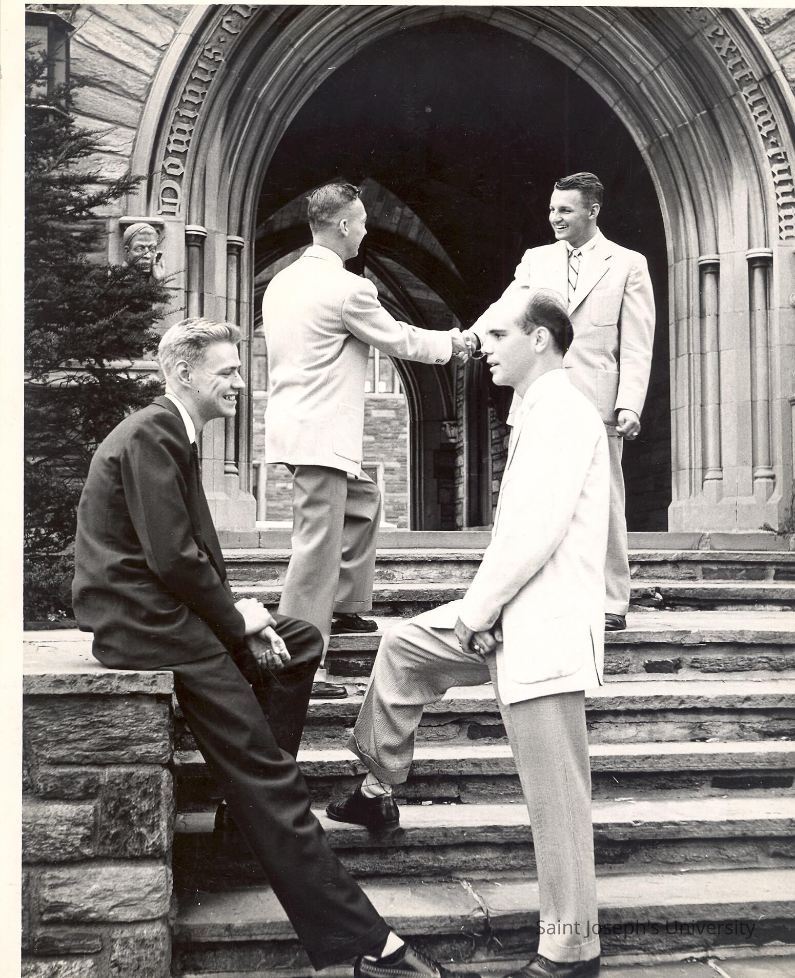 Students arriving for fall term and standing in front of archway entrance to Barbelin building. Students include Richard Thoden, Gilbert Smith, Raymond Dion, and Charles Carr.Entry/Object ID