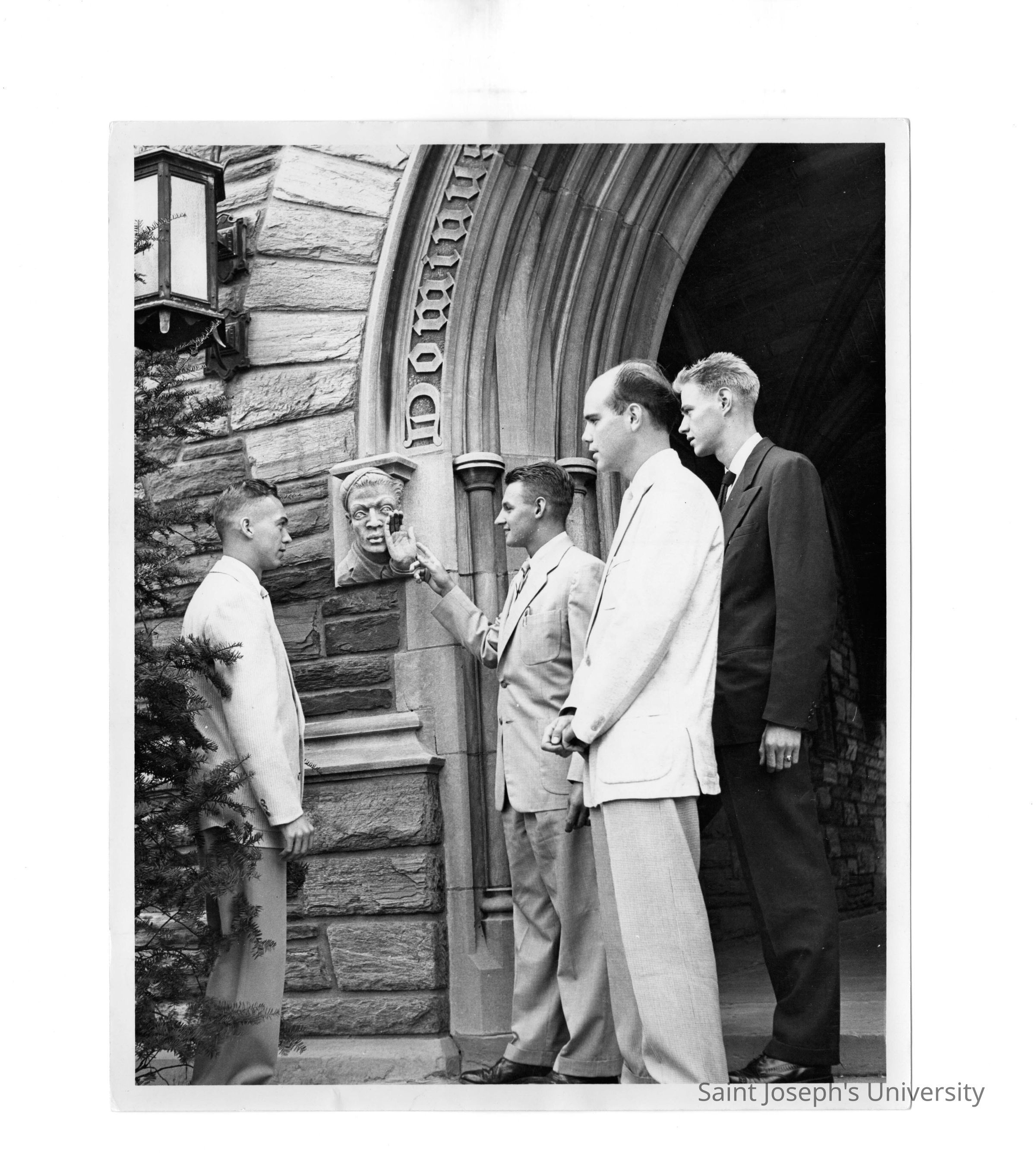 Students arriving for fall term looking at gargoyle at central arch of main entrance to Barbelin. Students include Raymond Dion, Charles T. Carr, Gilbert D. Smith, and Richard Thoden.Entry/Object ID