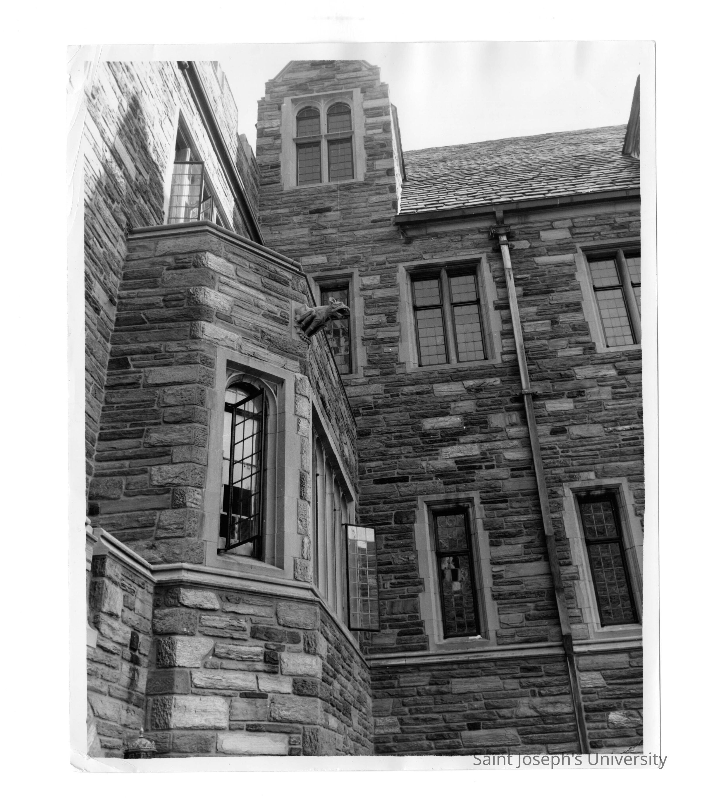 Exterior view of portion of Barbelin building showing windows and gargoyle.