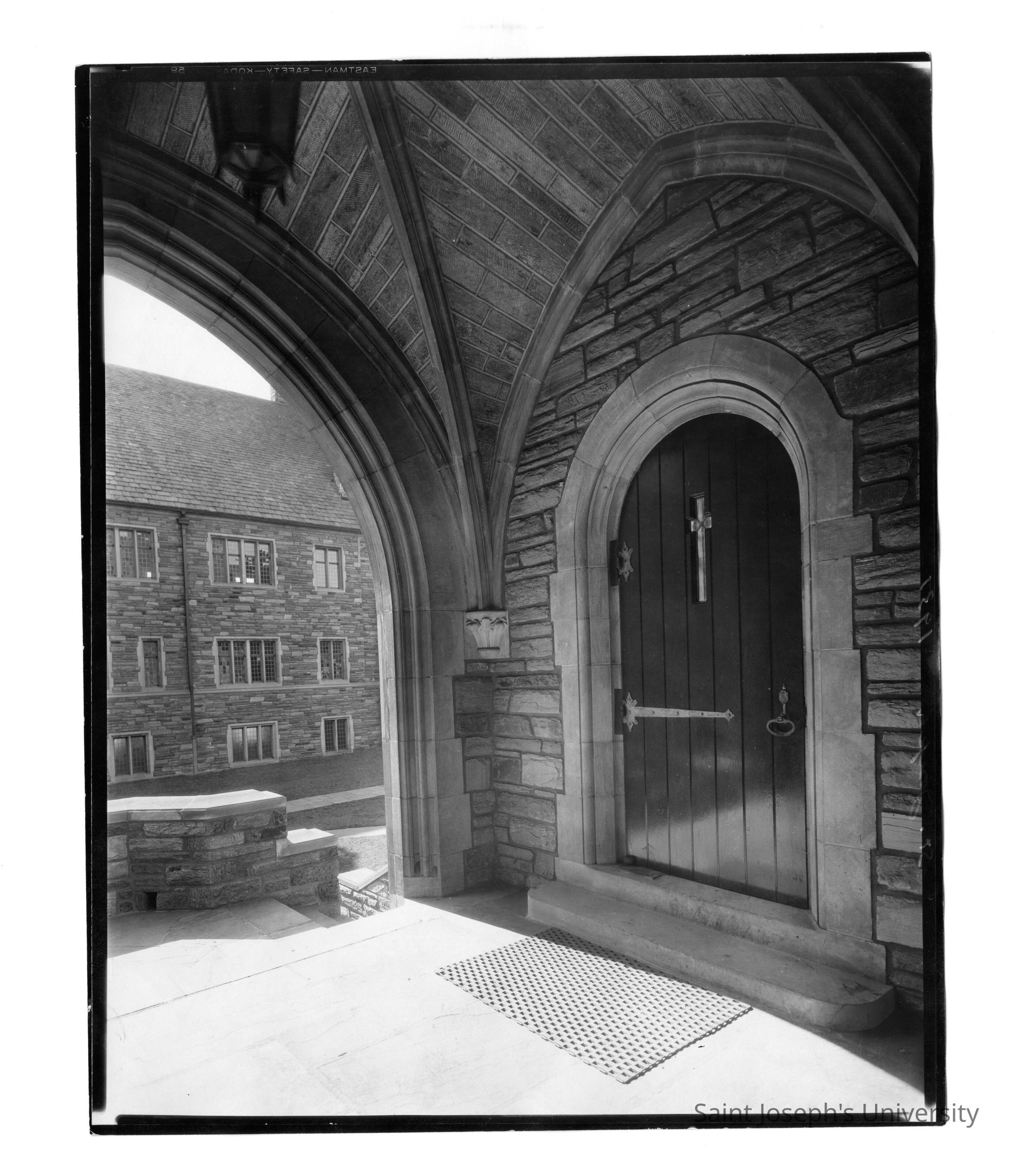 Exterior view of wooden door in central arch at main entrance of Barbelin building.