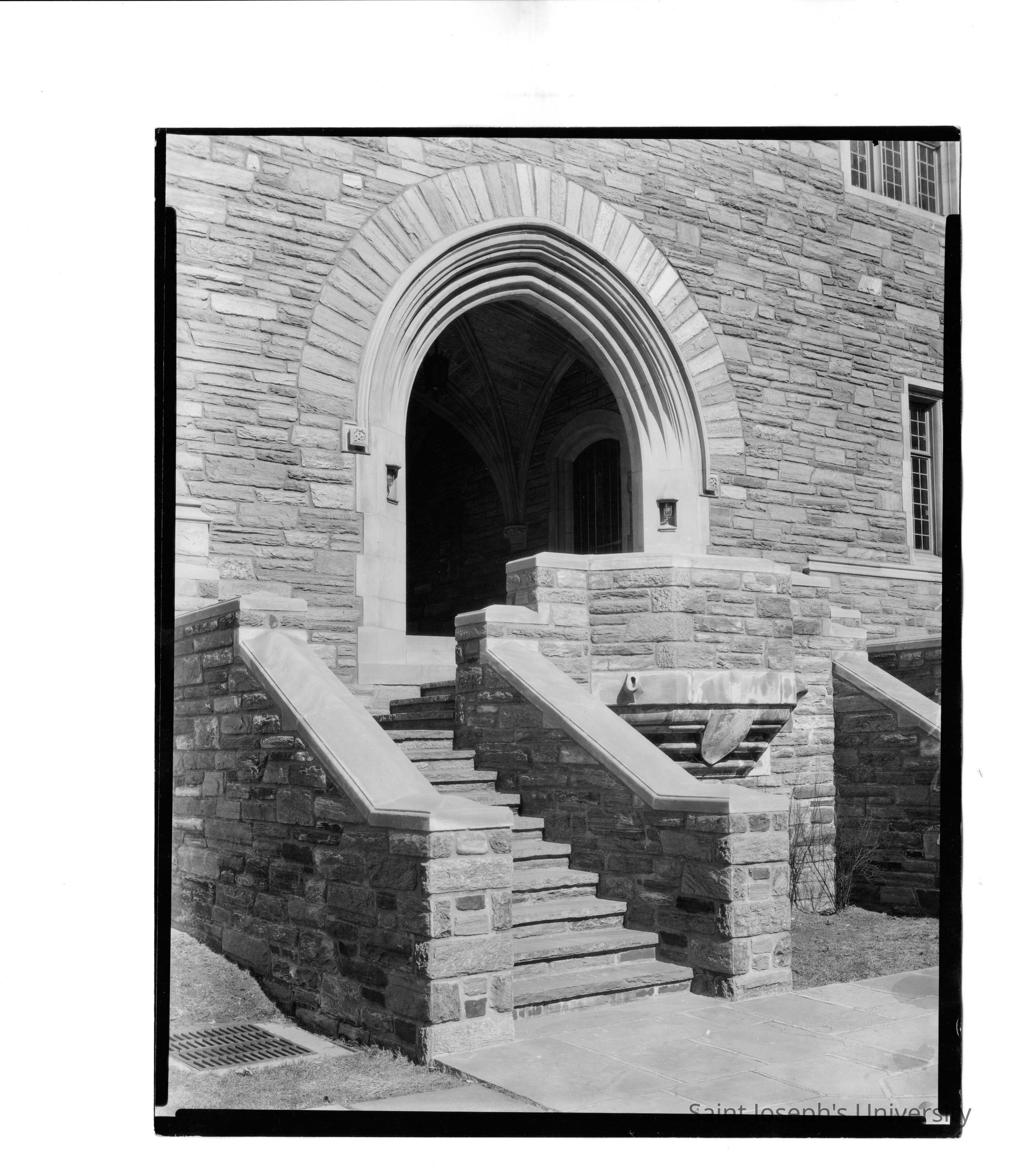 Exterior view of steps and central arch from Barbelin quadrangle before placement of statue of Blessed Virgin and plaque honoring students who died during World War Two.