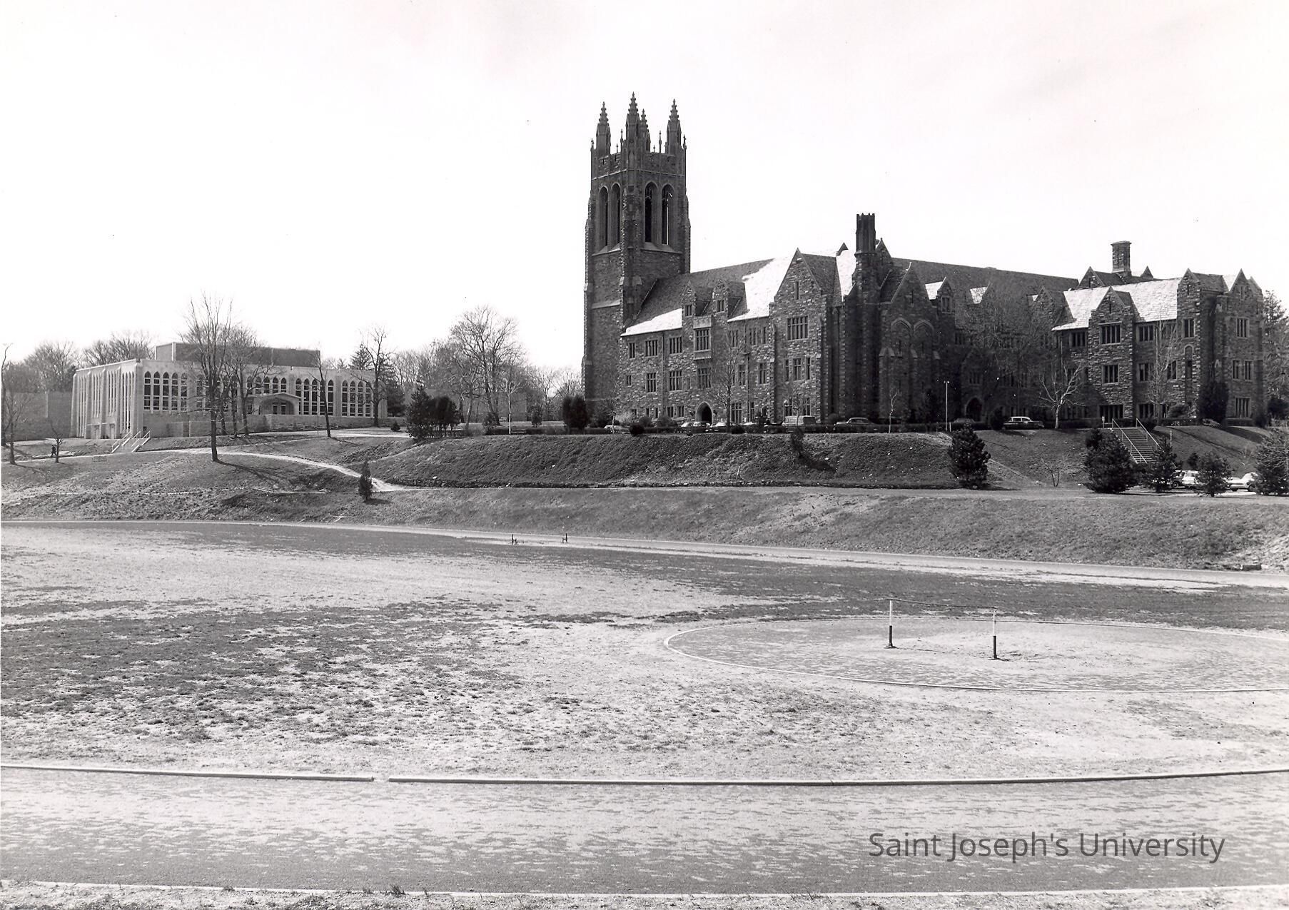 Exterior view of Barbelin building and Drexel Library from Finnesey Field.