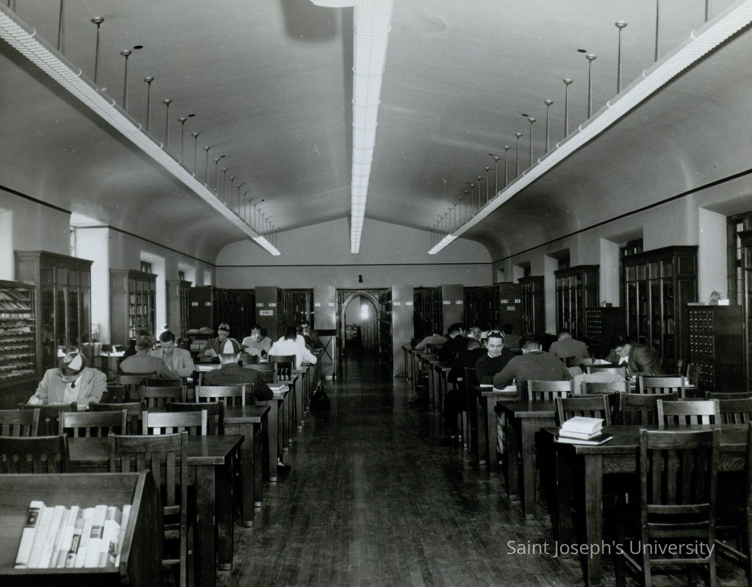 Interior view of library with students studying at desks in Barbelin building with several students wearing SJC striped caps.