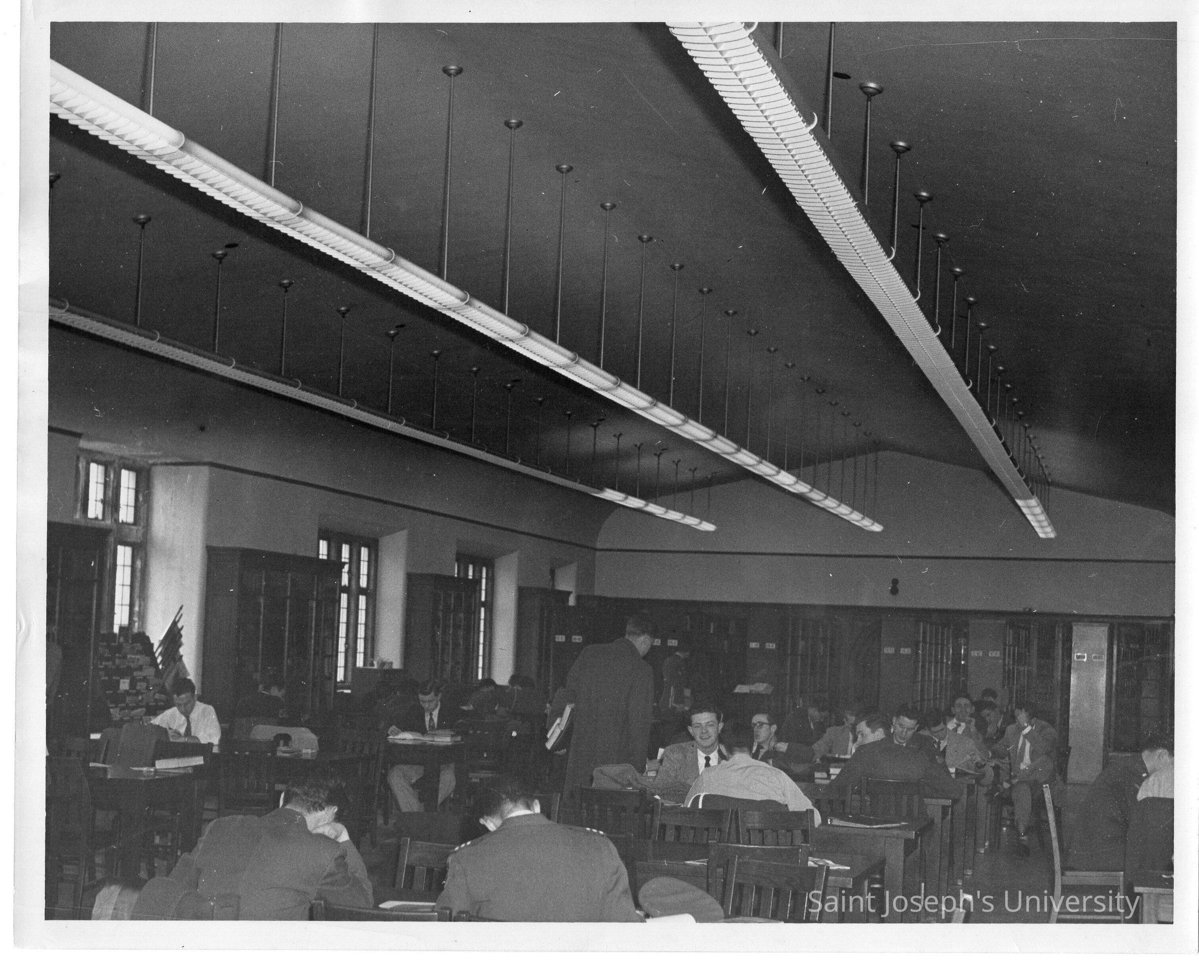 Interior view of library in Barbelin building with students studying at desks and talking.