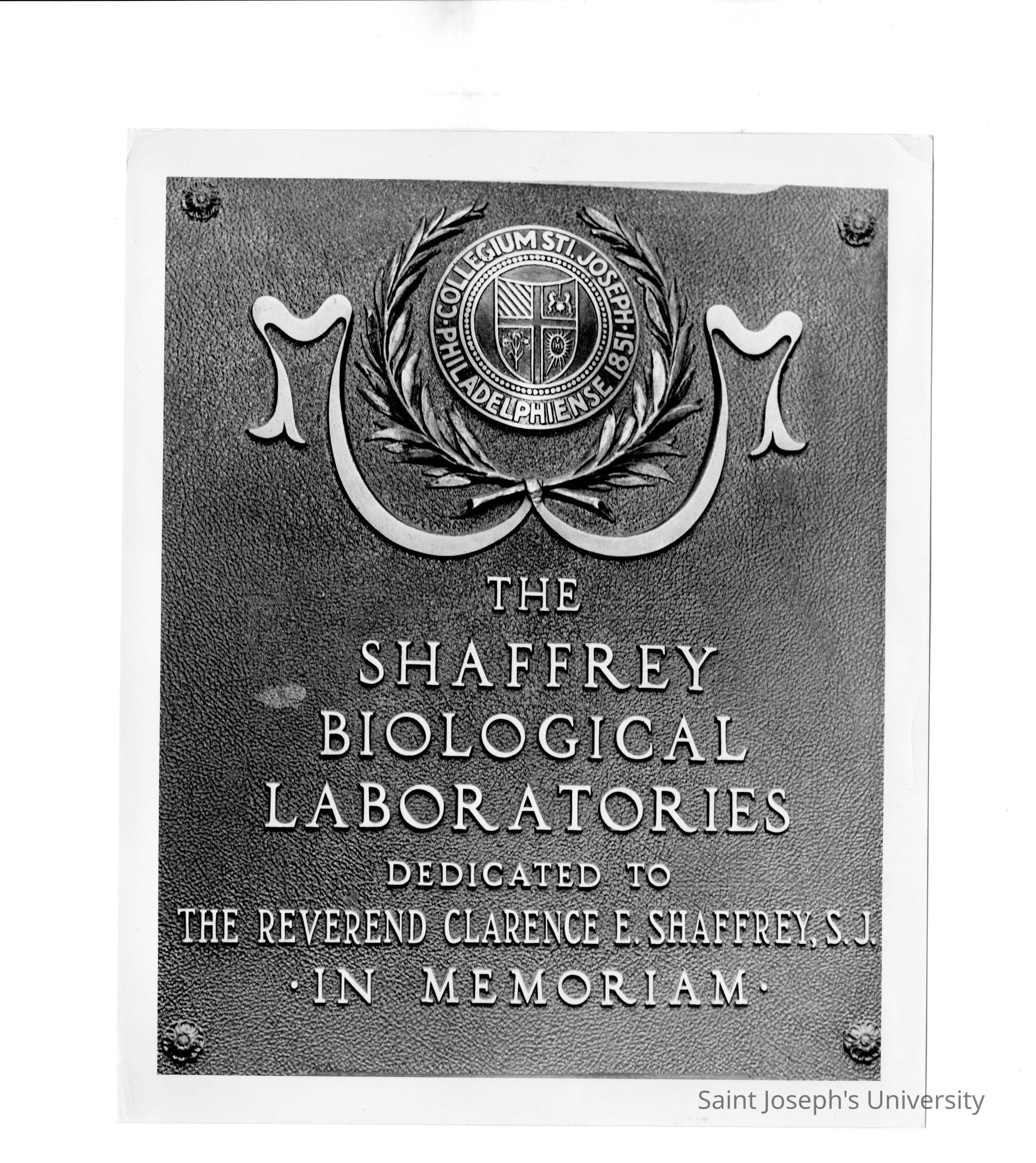 Dedication plaque entitled The Shaffrey Biological Laboratories in honor of Clarence E. Shaffrey, S.J. in Barbelin building.