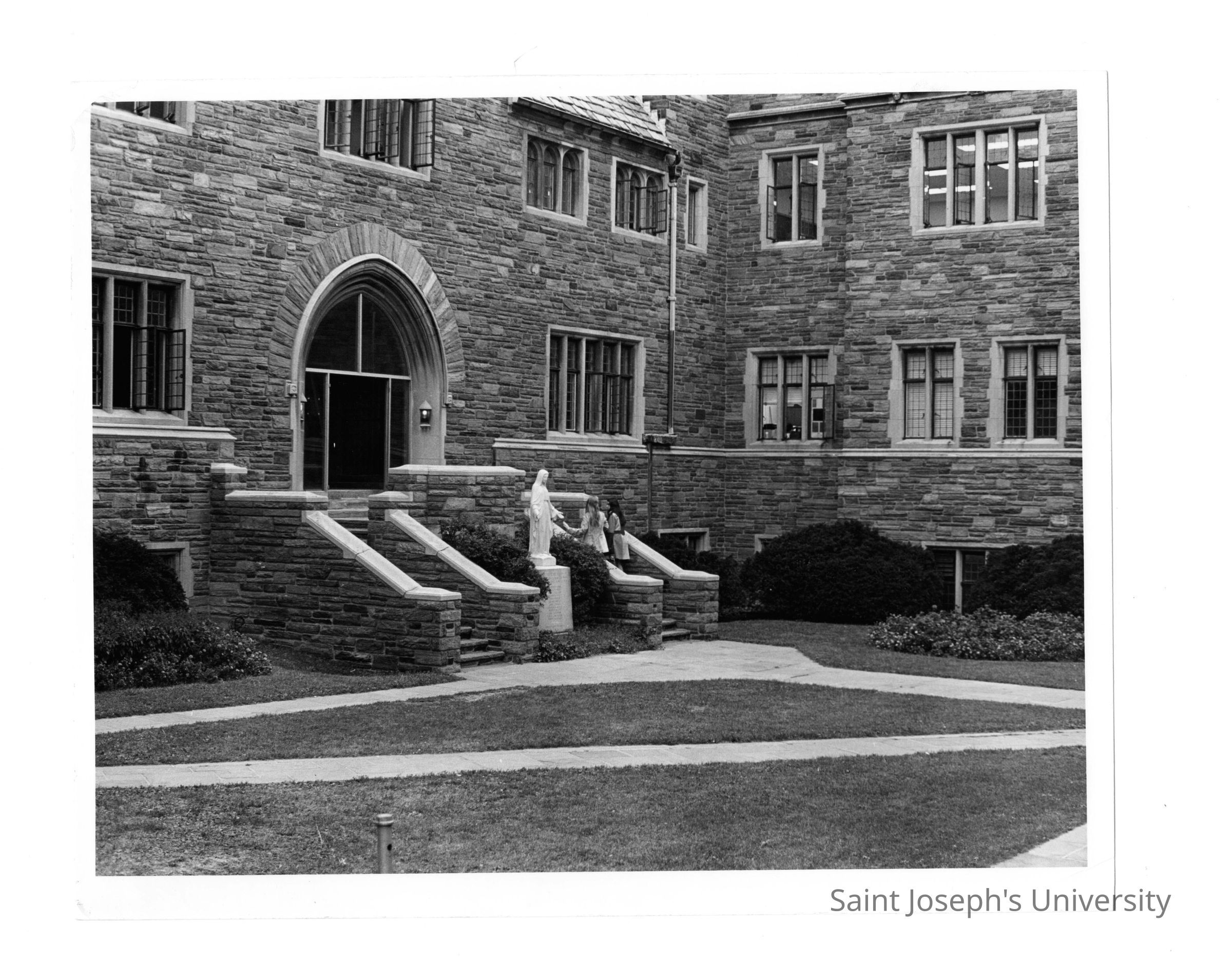 View of two female student walking up steps in Barbelin quadrangle near World War Two memorial.