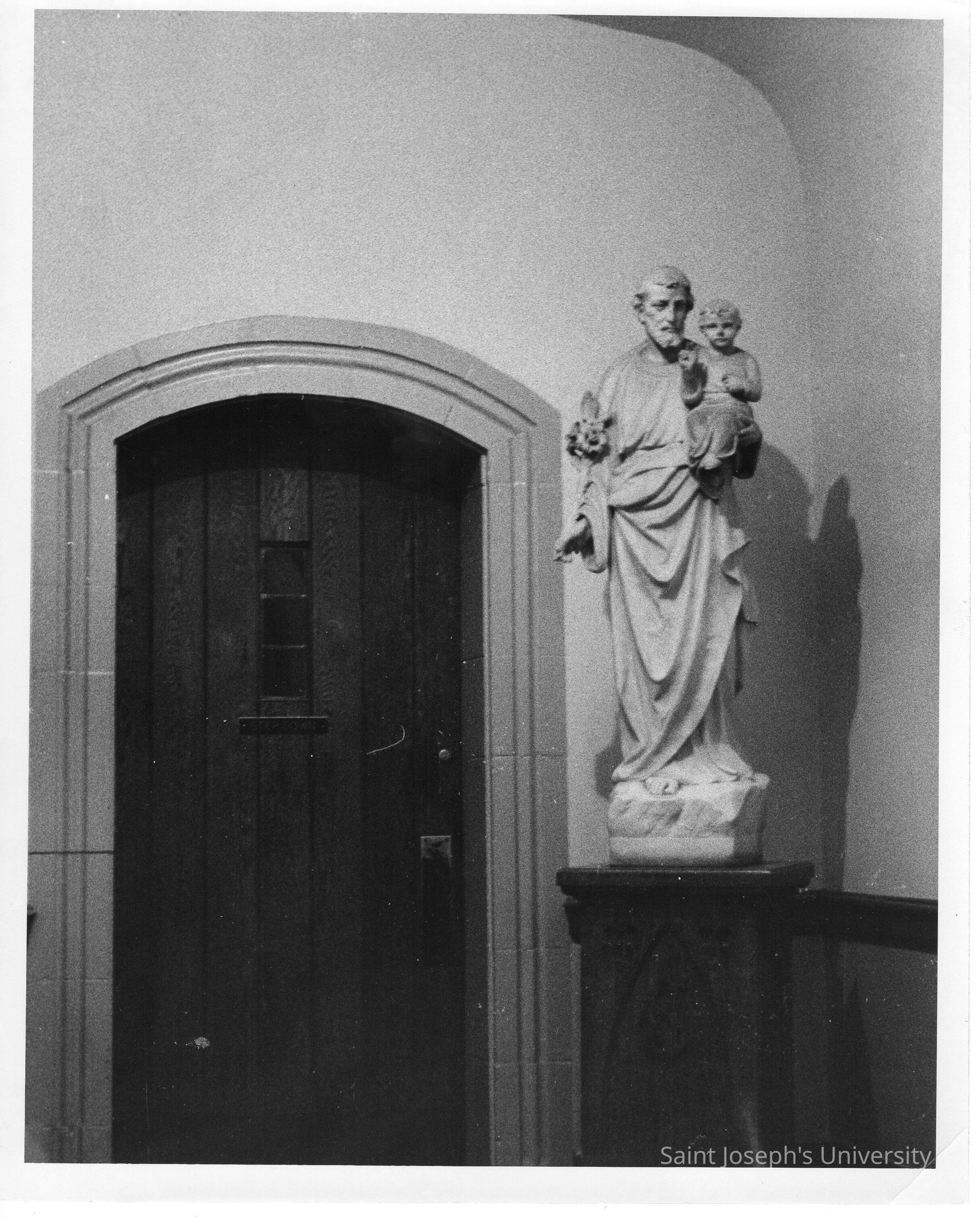 Interior view of hallway in Barbelin building with statue of Joseph holding the young Jesus.