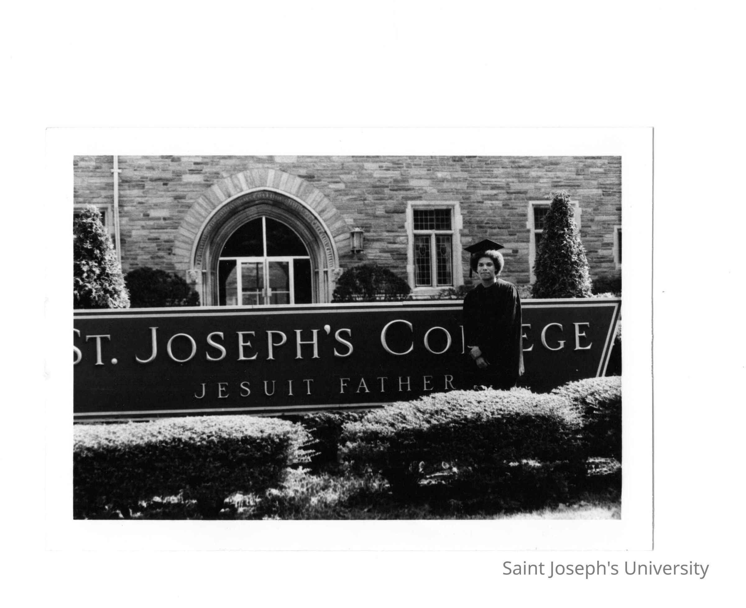 Student wearing cap and gown standing near Saint Joseph's College sign in front of Barbelin building.
