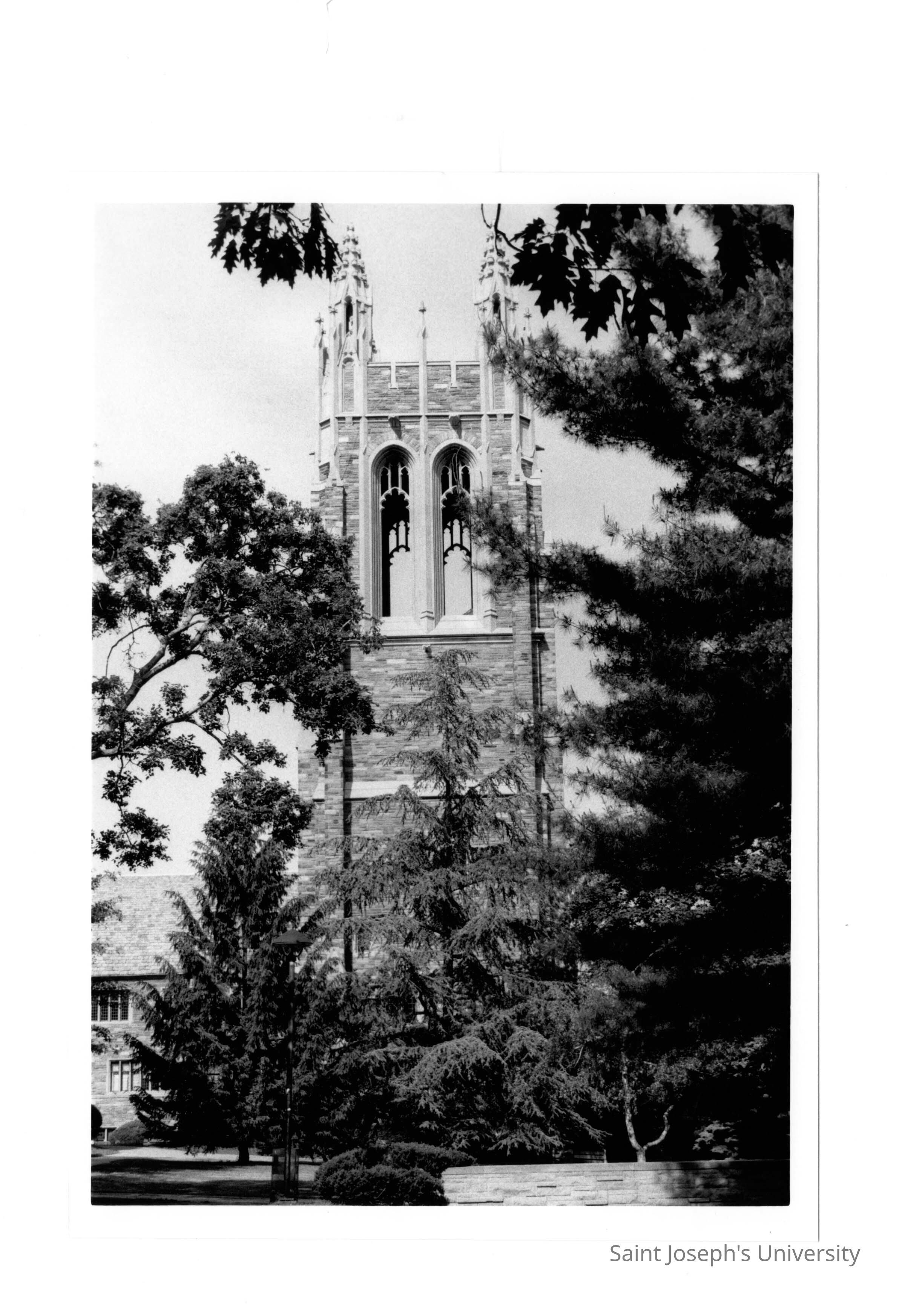 Exterior view of Barbelin Tower with evergreen trees in foreground.