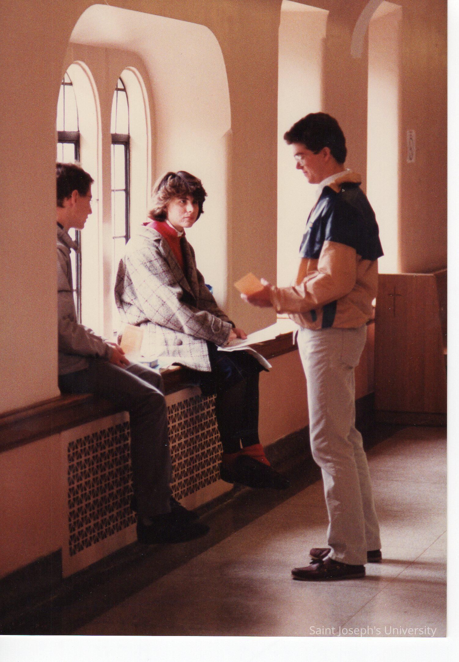 Interior view of students sitting in window alcove in hallway in Barbelin building.