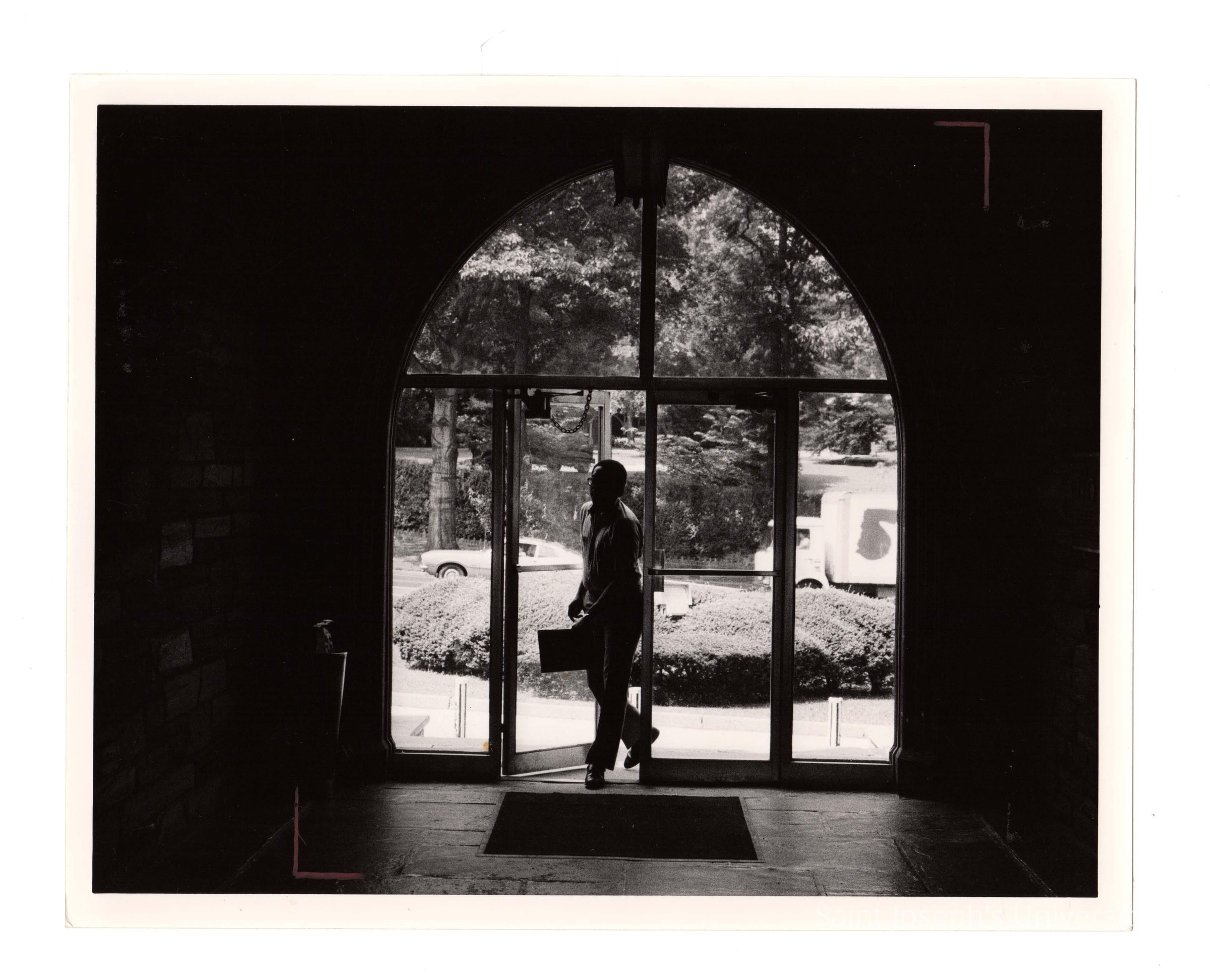 Interior view of man entering Barbelin through glass doors of central archway off City Avenue.
