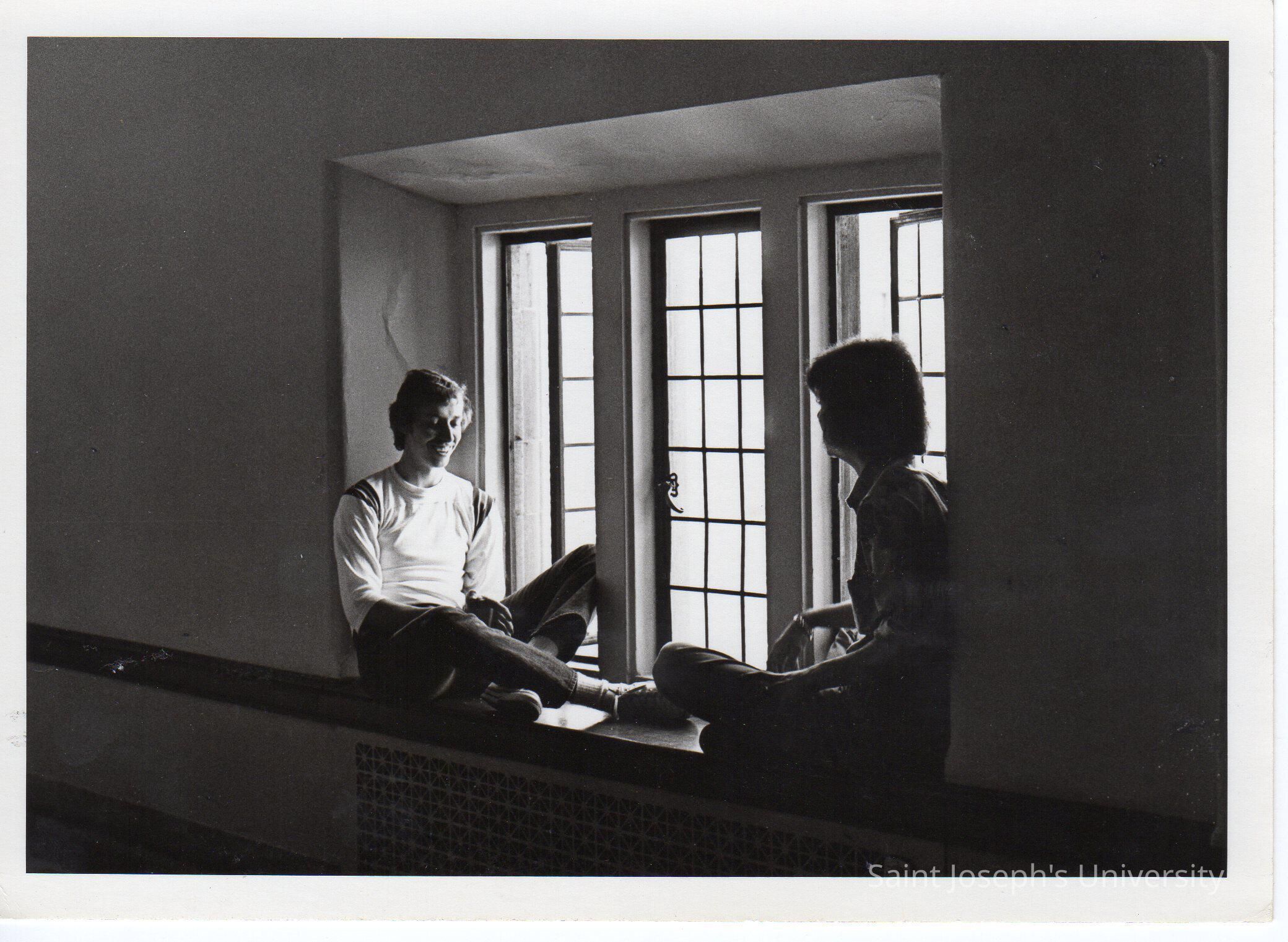 Interior view of two students sitting in window alcove in Barbelin hallway.