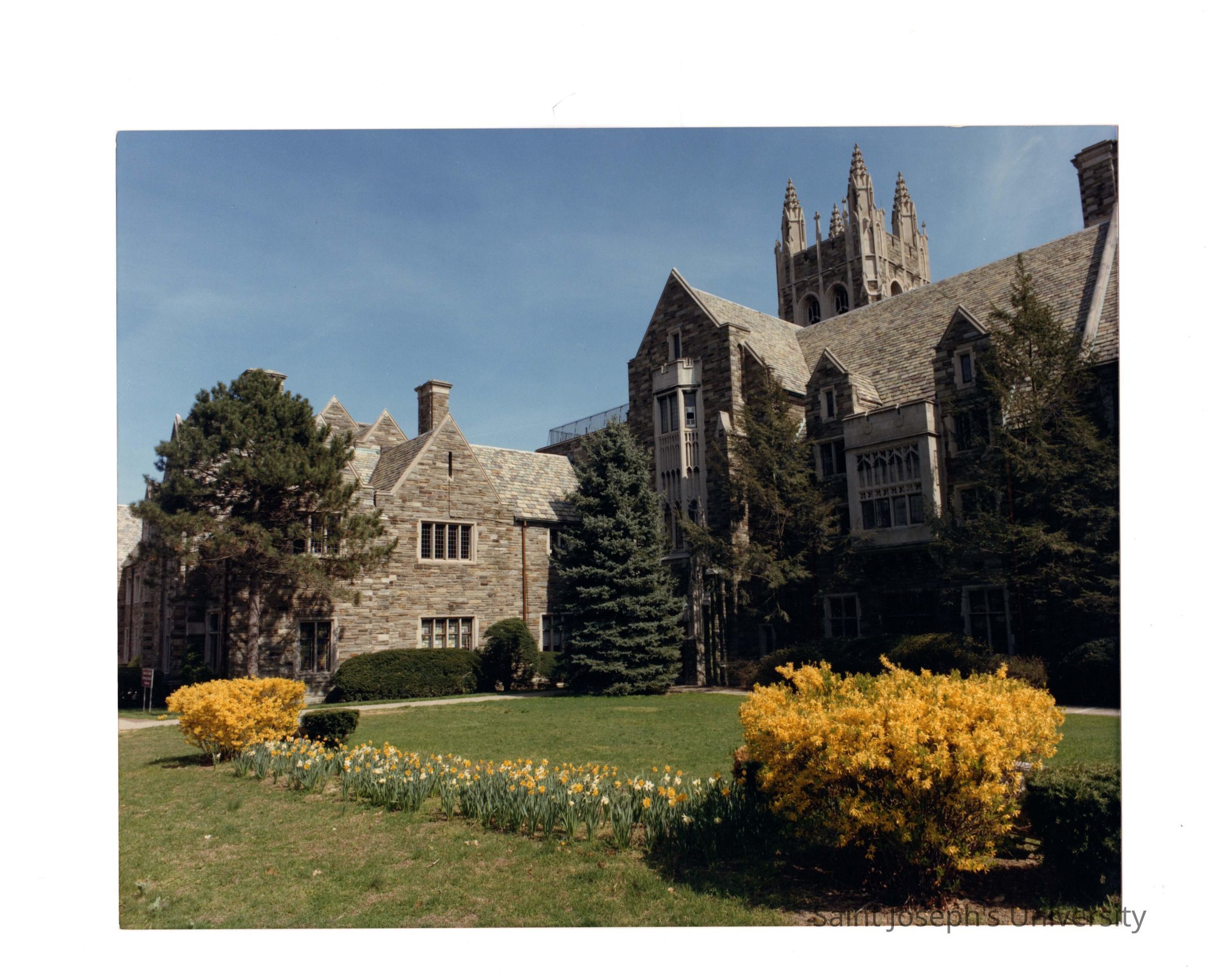 Exterior view of front of Barbelin in spring with daffodils and forsythia blooming.
