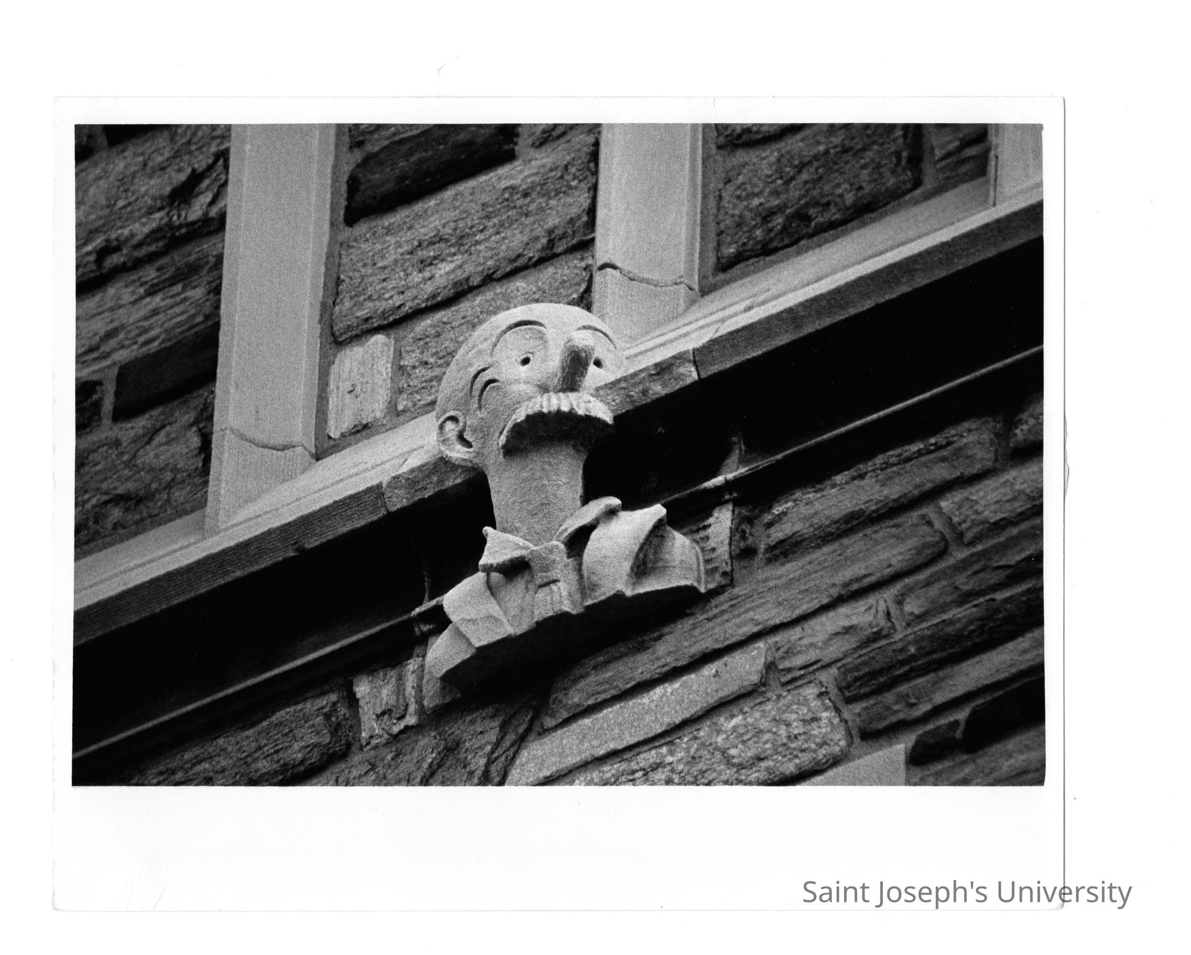 Gargoyle on exterior of Barbelin in likeness of Andy Gump, cartoon bungler of 1920s.