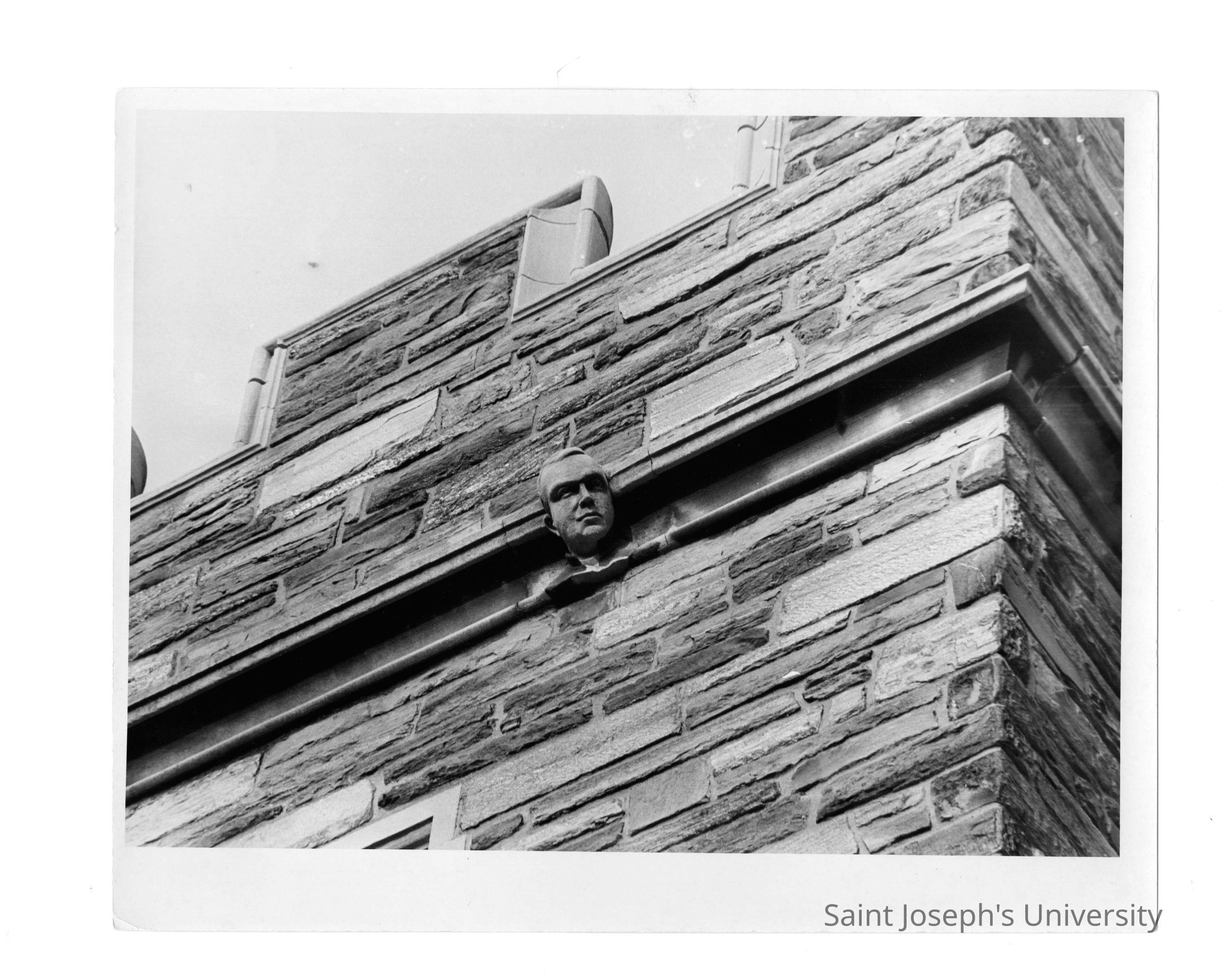Gargoyle on exterior of Barbelin in likeness of Cornelius Gillespie, S.J., president of Saint Joseph's College from 1908 to 1909.