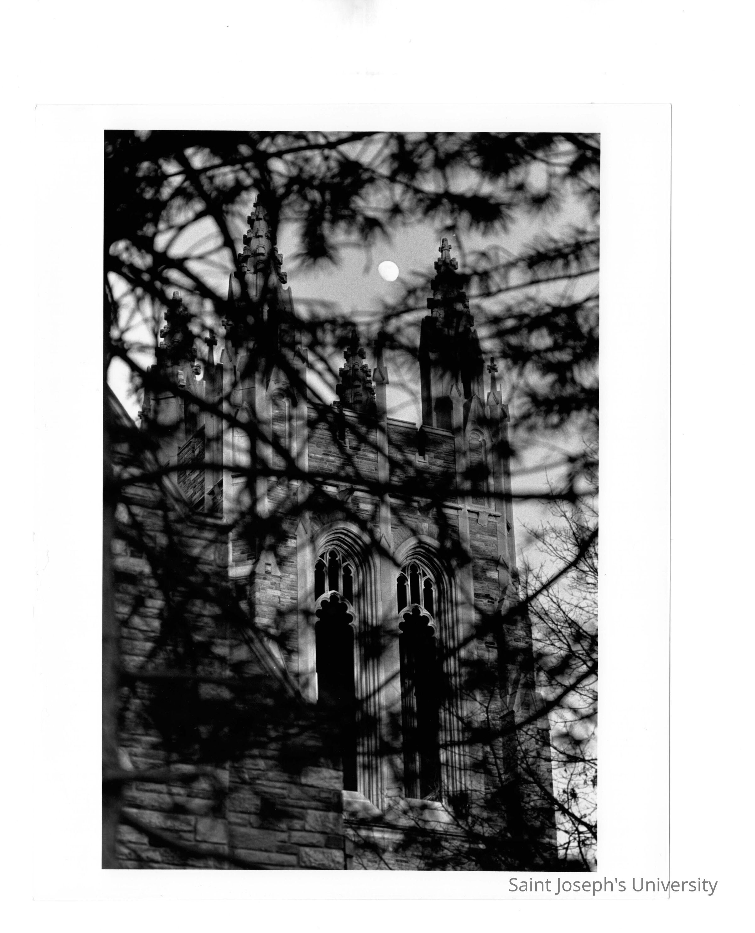 Exterior view of Barbelin Tower through evergreen tree limbs with moon in sky.