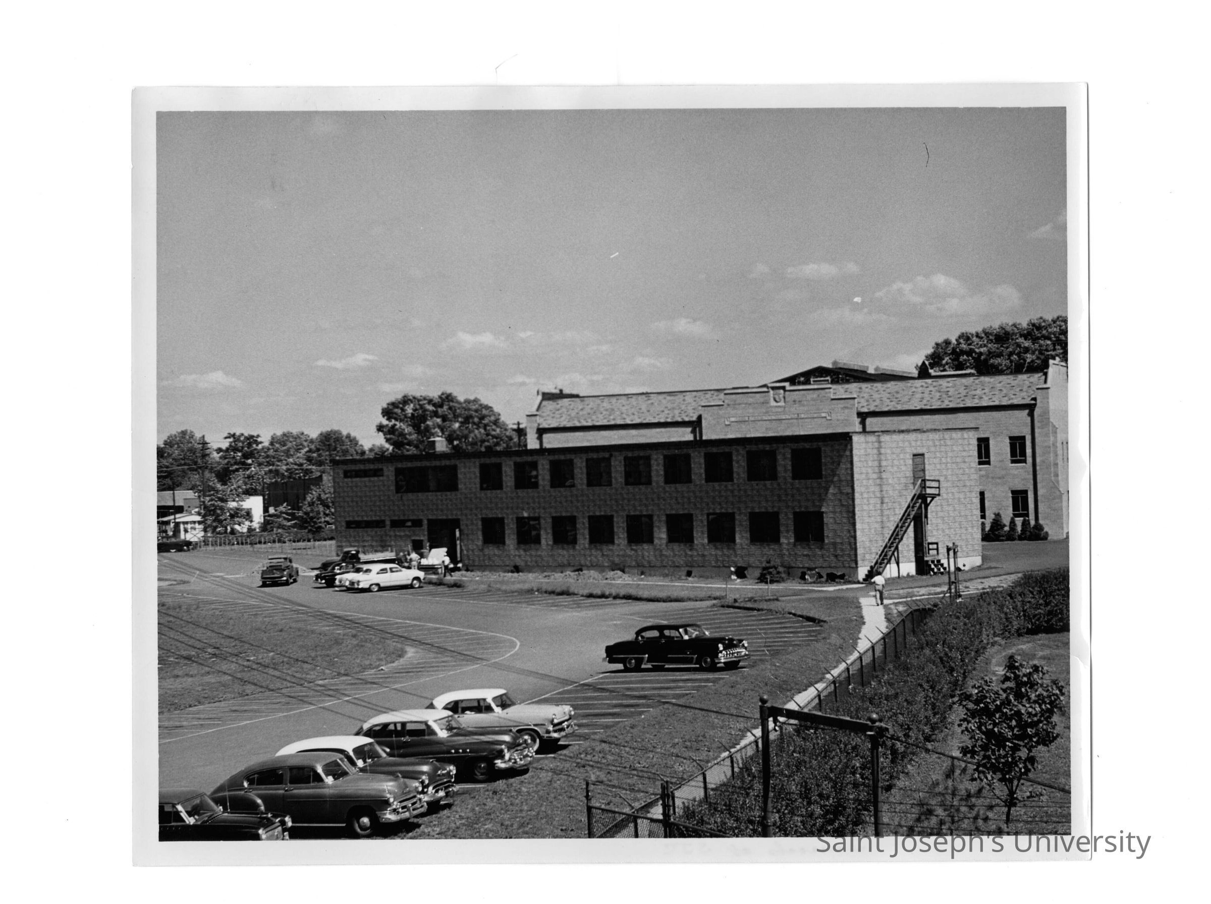 View of veterans barracks used as residence hall from parking lot with cars. Located near Cardboard College also known as Barbelin Annex.