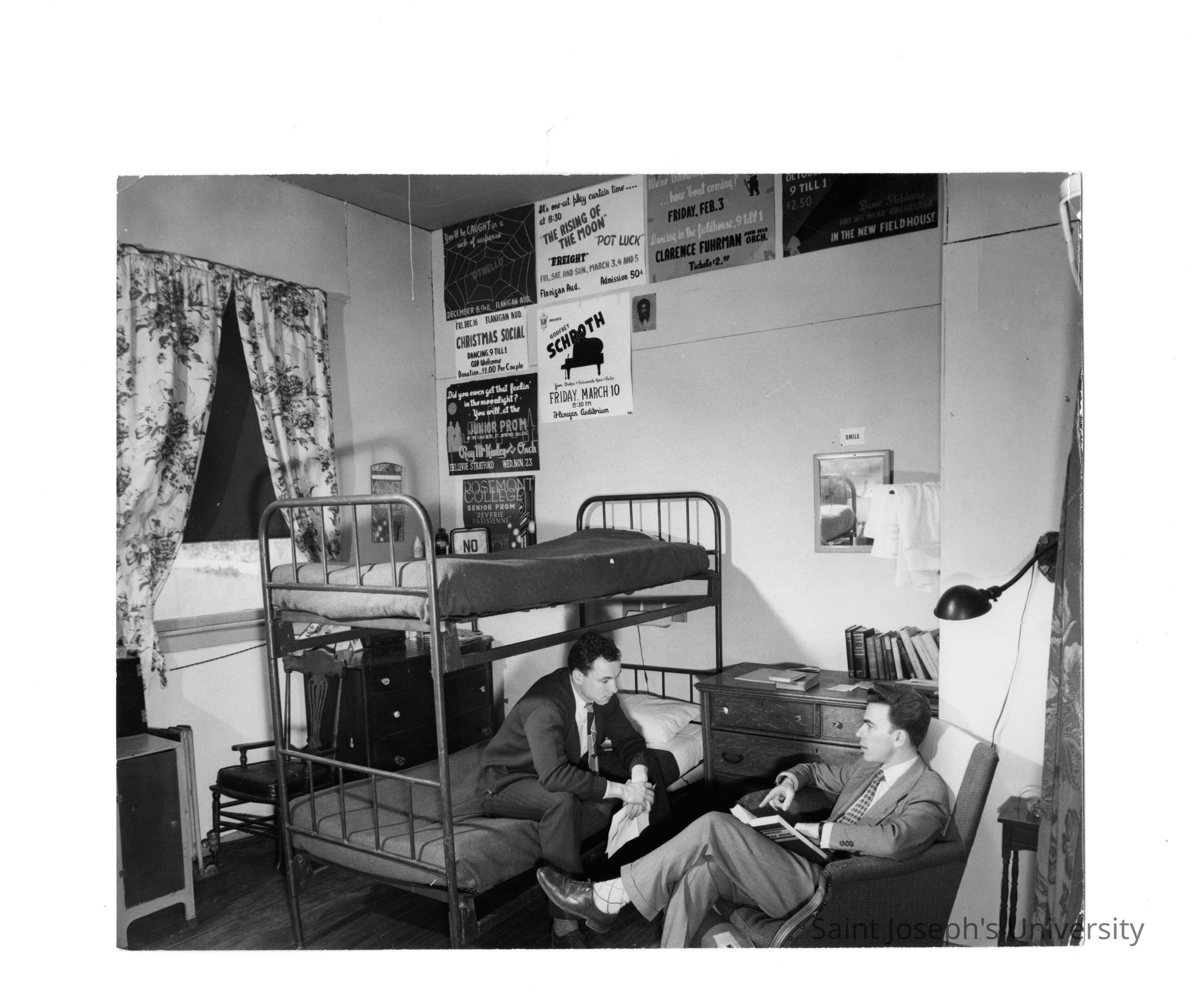 Two students in Veterans Barracks dorm room wearing coat and tie. Barracks located near Cardboard College also known as Barbelin Annex.