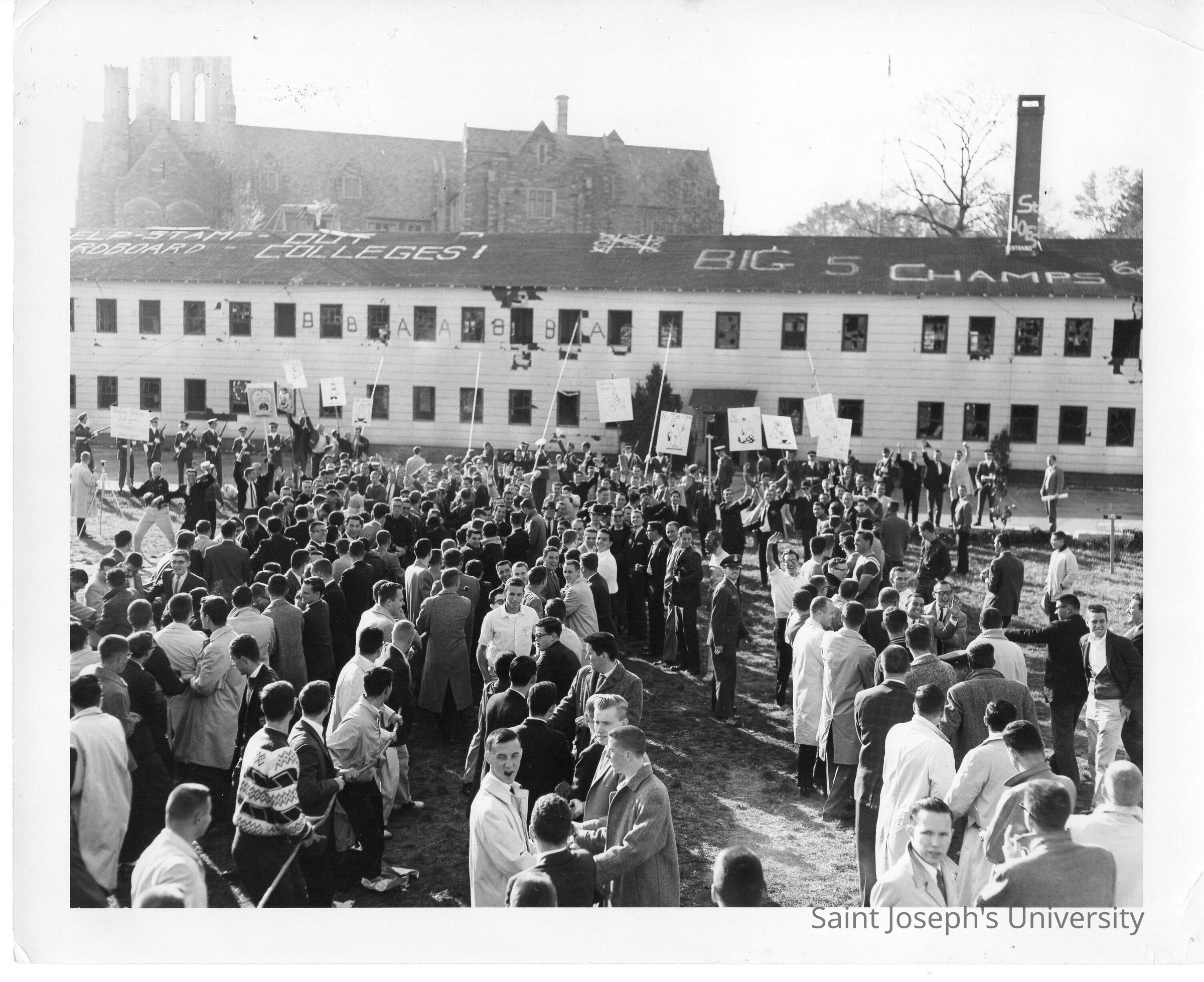 Student demonstration at Cardboard College also known as Barbelin Annex with sign on roof, "Help stamp out cardboard colleges!"