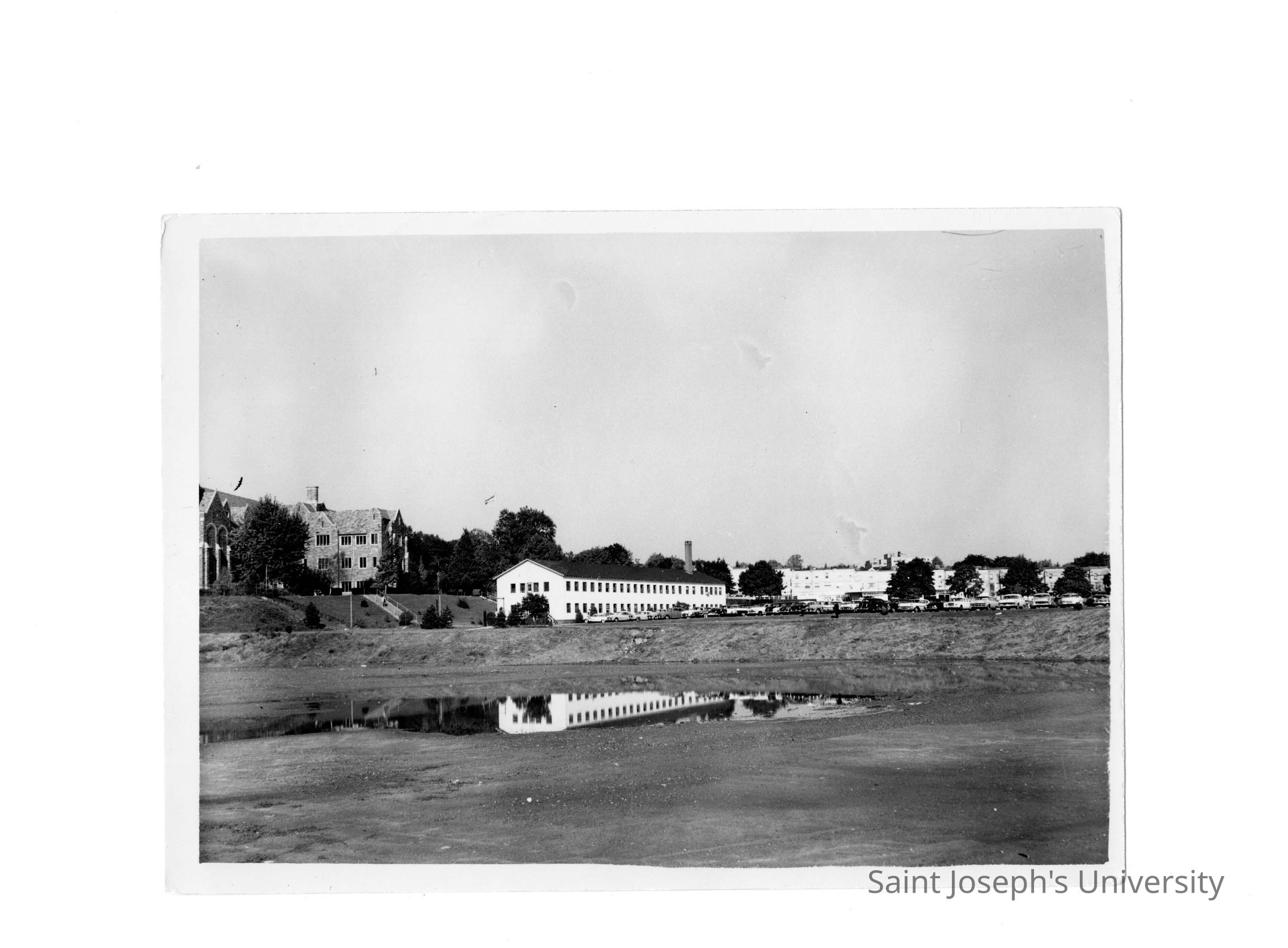 View of Cardboard College (also known as Barbelin Annex) and parking lot with cars from Finnesey Field.