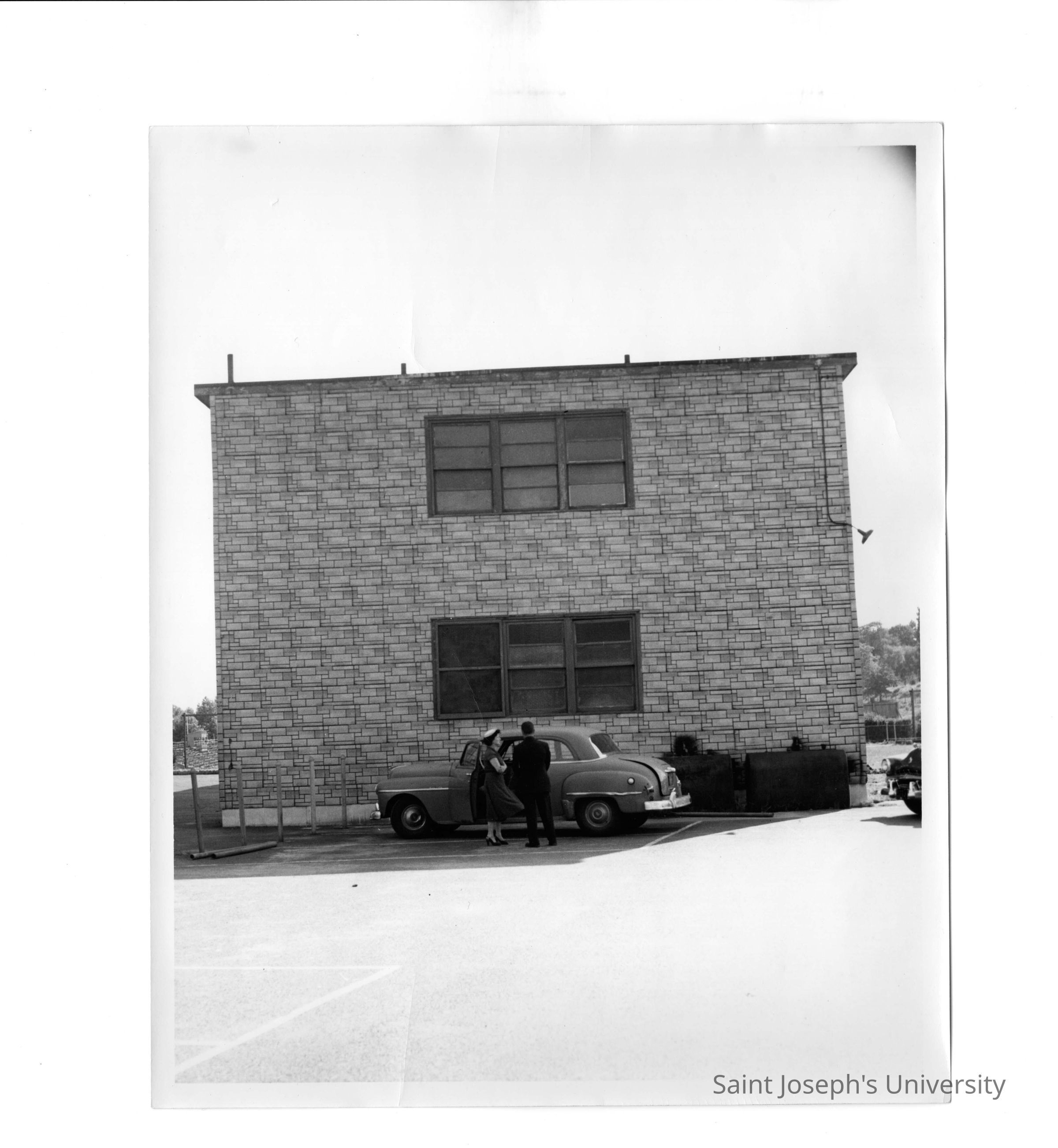 View of couple standing near car outside of veterans barracks located near the Cardboard College (also known as Barbelin Annex).